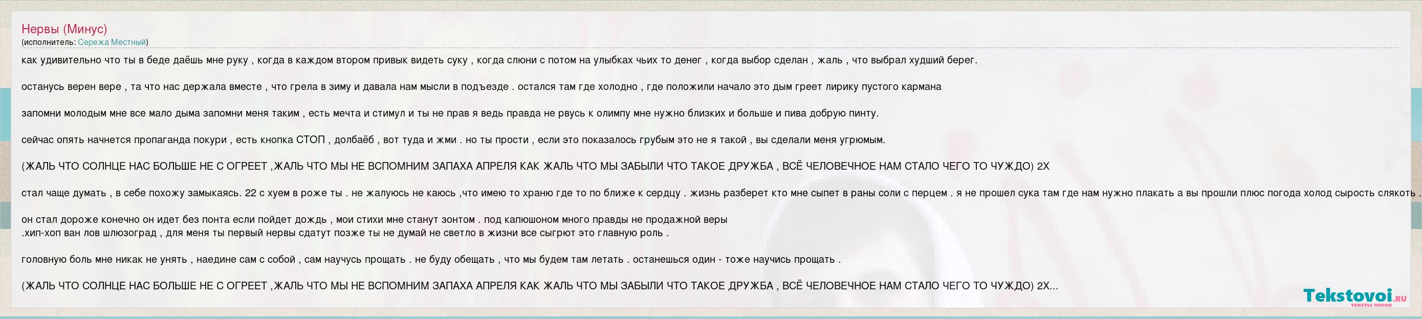 как удивительно что ты в беде даёшь мне руку , когда в каждом втором привык видеть суку , когда слюни с потом на улыбках чьих то денег , когда выбор сделан , жаль , что выбрал худший берег. останусь верен вере , та что нас держала вместе , что грела в зиму и давала нам мысли в подъезде . остался там где холодно , где положили начало это дым греет лирику пустого кармана запомни молодым мне все мало дыма запомни меня таким , есть мечта и стимул и ты не прав я ведь правда не рвусь к олимпу мне нужно близких и больше и пива добрую пинту. сейчас опять начнется пропаганда покури , есть кнопка СТОП , долбаёб , вот туда и жми . но ты прости , если это показалось грубым это не я такой , вы сделали меня угрюмым. (ЖАЛЬ ЧТО СОЛНЦЕ НАС БОЛЬШЕ НЕ С ОГРЕЕТ ,ЖАЛЬ ЧТО МЫ НЕ ВСПОМНИМ ЗАПАХА АПРЕЛЯ КАК ЖАЛЬ ЧТО МЫ ЗАБЫЛИ ЧТО ТАКОЕ ДРУЖБА , ВСЁ ЧЕЛОВЕЧНОЕ НАМ СТАЛО ЧЕГО ТО ЧУЖДО) 2Х стал чаще думать , в себе похожу замыкаясь. 22 с хуем в роже ты . не жалуюсь не каюсь ,что имею то храню где то по ближе к сердцу . жизнь разберет кто мне сыпет в раны соли с перцем . я не прошел сука там где нам нужно плакать а вы прошли плюс погода холод сырость слякоть . он стал дороже конечно он идет без понта если пойдет дождь , мои стихи мне станут зонтом . под капюшоном много правды не продажной веры .хип-хоп ван лов шлюзоград , для меня ты первый нервы сдатут позже ты не думай не светло в жизни все сыгрют это главную роль . головную боль мне никак не унять , наедине сам с собой , сам научусь прощать . не буду обещать , что мы будем там летать . останешься один - тоже научись прощать . (ЖАЛЬ ЧТО СОЛНЦЕ НАС БОЛЬШЕ НЕ С ОГРЕЕТ ,ЖАЛЬ ЧТО МЫ НЕ ВСПОМНИМ ЗАПАХА АПРЕЛЯ КАК ЖАЛЬ ЧТО МЫ ЗАБЫЛИ ЧТО ТАКОЕ ДРУЖБА , ВСЁ ЧЕЛОВЕЧНОЕ НАМ СТАЛО ЧЕГО ТО ЧУЖДО) 2Х...