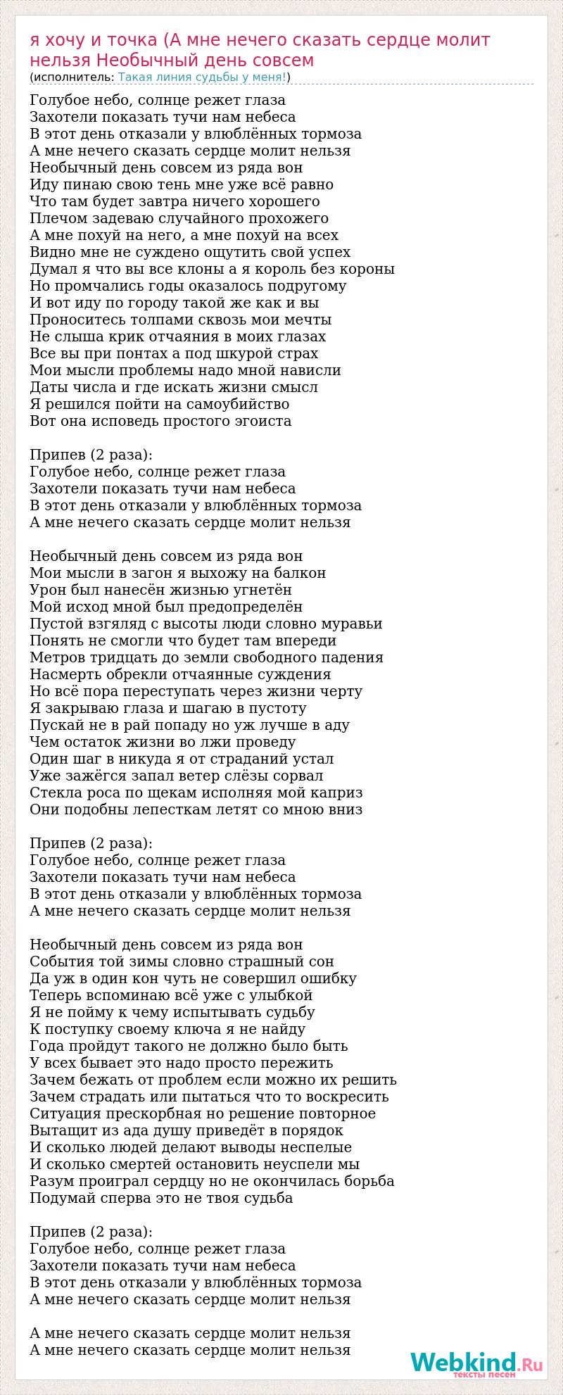 Голубое небо, солнце режет глаза Захотели показать тучи нам небеса В этот день отказали у влюблённых тормоза А мне нечего сказать сердце молит нельзя Необычный день совсем из ряда вон Иду пинаю свою тень мне уже всё равно Что там будет завтра ничего хорошего Плечом задеваю случайного прохожего А мне похуй на него, а мне похуй на всех Видно мне не суждено ощутить свой успех Думал я что вы все клоны а я король без короны Но промчались годы оказалось подругому И вот иду по городу такой же как и вы Проноситесь толпами сквозь мои мечты Не слыша крик отчаяния в моих глазах Все вы при понтах а под шкурой страх Мои мысли проблемы надо мной нависли Даты числа и где искать жизни смысл Я решился пойти на самоубийство Вот она исповедь простого эгоиста Припев (2 раза): Голубое небо, солнце режет глаза Захотели показать тучи нам небеса В этот день отказали у влюблённых тормоза А мне нечего сказать сердце молит нельзя Необычный день совсем из ряда вон Мои мысли в загон я выхожу на балкон Урон был нанесён жизнью угнетён Мой исход мной был предопределён Пустой взгяляд с высоты люди словно муравьи Понять не смогли что будет там впереди Метров тридцать до земли свободного падения Насмерть обрекли отчаянные суждения Но всё пора переступать через жизни черту Я закрываю глаза и шагаю в пустоту Пускай не в рай попаду но уж лучше в аду Чем остаток жизни во лжи проведу Один шаг в никуда я от страданий устал Уже зажёгся запал ветер слёзы сорвал Стекла роса по щекам исполняя мой каприз Они подобны лепесткам летят со мною вниз Припев (2 раза): Голубое небо, солнце режет глаза Захотели показать тучи нам небеса В этот день отказали у влюблённых тормоза А мне нечего сказать сердце молит нельзя Необычный день совсем из ряда вон События той зимы словно страшный сон Да уж в один кон чуть не совершил ошибку Теперь вспоминаю всё уже с улыбкой Я не пойму к чему испытывать судьбу К поступку своему ключа я не найду Года пройдут такого не должно было быть У всех бывает это надо просто пережить Зачем бежать от проблем если можно их решить Зачем страдать или пытаться что то воскресить Ситуация прескорбная но решение повторное Вытащит из ада душу приведёт в порядок И сколько людей делают выводы неспелые И сколько смертей остановить неуспели мы Разум проиграл сердцу но не окончилась борьба Подумай сперва это не твоя судьба Припев (2 раза): Голубое небо, солнце режет глаза Захотели показать тучи нам небеса В этот день отказали у влюблённых тормоза А мне нечего сказать сердце молит нельзя А мне нечего сказать сердце молит нельзя А мне нечего сказать сердце молит нельзя