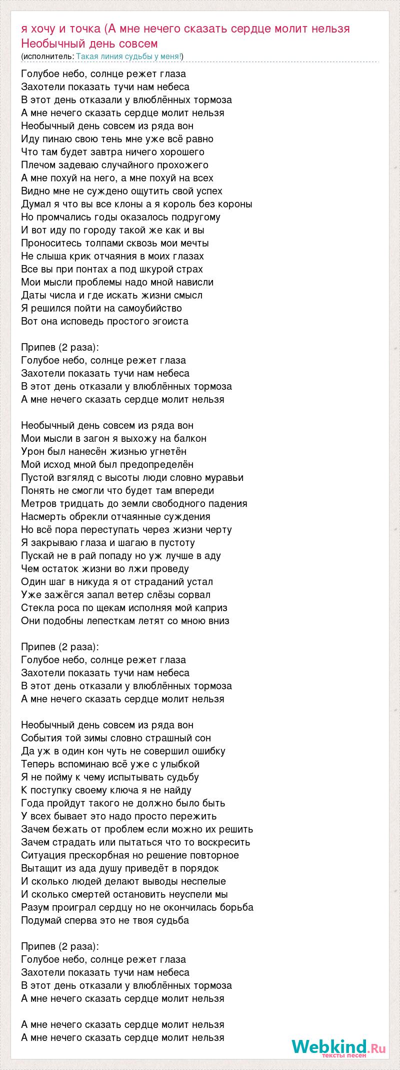 Голубое небо, солнце режет глаза Захотели показать тучи нам небеса В этот день отказали у влюблённых тормоза А мне нечего сказать сердце молит нельзя Необычный день совсем из ряда вон Иду пинаю свою тень мне уже всё равно Что там будет завтра ничего хорошего Плечом задеваю случайного прохожего А мне похуй на него, а мне похуй на всех Видно мне не суждено ощутить свой успех Думал я что вы все клоны а я король без короны Но промчались годы оказалось подругому И вот иду по городу такой же как и вы Проноситесь толпами сквозь мои мечты Не слыша крик отчаяния в моих глазах Все вы при понтах а под шкурой страх Мои мысли проблемы надо мной нависли Даты числа и где искать жизни смысл Я решился пойти на самоубийство Вот она исповедь простого эгоиста Припев (2 раза): Голубое небо, солнце режет глаза Захотели показать тучи нам небеса В этот день отказали у влюблённых тормоза А мне нечего сказать сердце молит нельзя Необычный день совсем из ряда вон Мои мысли в загон я выхожу на балкон Урон был нанесён жизнью угнетён Мой исход мной был предопределён Пустой взгяляд с высоты люди словно муравьи Понять не смогли что будет там впереди Метров тридцать до земли свободного падения Насмерть обрекли отчаянные суждения Но всё пора переступать через жизни черту Я закрываю глаза и шагаю в пустоту Пускай не в рай попаду но уж лучше в аду Чем остаток жизни во лжи проведу Один шаг в никуда я от страданий устал Уже зажёгся запал ветер слёзы сорвал Стекла роса по щекам исполняя мой каприз Они подобны лепесткам летят со мною вниз Припев (2 раза): Голубое небо, солнце режет глаза Захотели показать тучи нам небеса В этот день отказали у влюблённых тормоза А мне нечего сказать сердце молит нельзя Необычный день совсем из ряда вон События той зимы словно страшный сон Да уж в один кон чуть не совершил ошибку Теперь вспоминаю всё уже с улыбкой Я не пойму к чему испытывать судьбу К поступку своему ключа я не найду Года пройдут такого не должно было быть У всех бывает это надо просто пережить Зачем бежать от проблем если можно их решить Зачем страдать или пытаться что то воскресить Ситуация прескорбная но решение повторное Вытащит из ада душу приведёт в порядок И сколько людей делают выводы неспелые И сколько смертей остановить неуспели мы Разум проиграл сердцу но не окончилась борьба Подумай сперва это не твоя судьба Припев (2 раза): Голубое небо, солнце режет глаза Захотели показать тучи нам небеса В этот день отказали у влюблённых тормоза А мне нечего сказать сердце молит нельзя А мне нечего сказать сердце молит нельзя А мне нечего сказать сердце молит нельзя