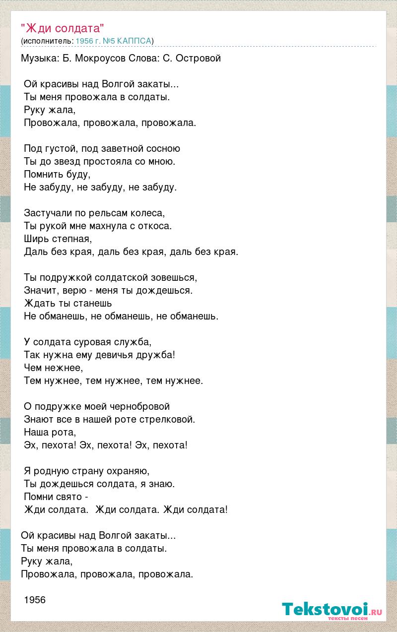 Музыка: Б. Мокроусов Слова: С. Островой Ой красивы над Волгой закаты... Ты меня провожала в солдаты. Руку жала, Провожала, провожала, провожала. Под густой, под заветной сосною Ты до звезд простояла со мною. Помнить буду, Не забуду, не забуду, не забуду. Застучали по рельсам колеса, Ты рукой мне махнула с откоса. Ширь степная, Даль без края, даль без края, даль без края. Ты подружкой солдатской зовешься, Значит, верю - меня ты дождешься. Ждать ты станешь Не обманешь, не обманешь, не обманешь. У солдата суровая служба, Так нужна ему девичья дружба! Чем нежнее, Тем нужнее, тем нужнее, тем нужнее. О подружке моей чернобровой Знают все в нашей роте стрелковой. Наша рота, Эх, пехота! Эх, пехота! Эх, пехота! Я родную страну охраняю, Ты дождешься солдата, я знаю. Помни свято - Жди солдата. Жди солдата. Жди солдата! Ой красивы над Волгой закаты... Ты меня провожала в солдаты. Руку жала, Провожала, провожала, провожала. 1956