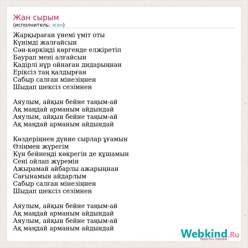 Жарқыраған үнемi үмiт оты Күнiмдi жалғайсын Сән-көркiңдi көргенде елжiретiп Баурап менi алғайсын Қадiрлі нұр ойнаған дидарыңнан Ерiксiз таң қалдырған Сабыр салған мiнезiңнен Шыдап шексiз сезiмнен Аяулым, айқын бейне таңым-ай Ақ маңдай арманым айдындай Аяулым, айқын бейне таңым-ай Ақ маңдай арманым айдындай Көздерiңнен дүние сырлар ұғамын Өзiңмен жүрегiм Күн бейнеңді көкрегiн де құшамын Сенi ойлап жүремiн Ажырамай айбарлы ажарыңнан Сағынамын айдарлым Сабыр салған мiнезiңнен Шыдап шексiз сезiмнен Аяулым, айқын бейне таңым-ай Ақ маңдай арманым айдындай Аяулым, айқын бейне таңым-ай Ақ маңдай арманым айдындай