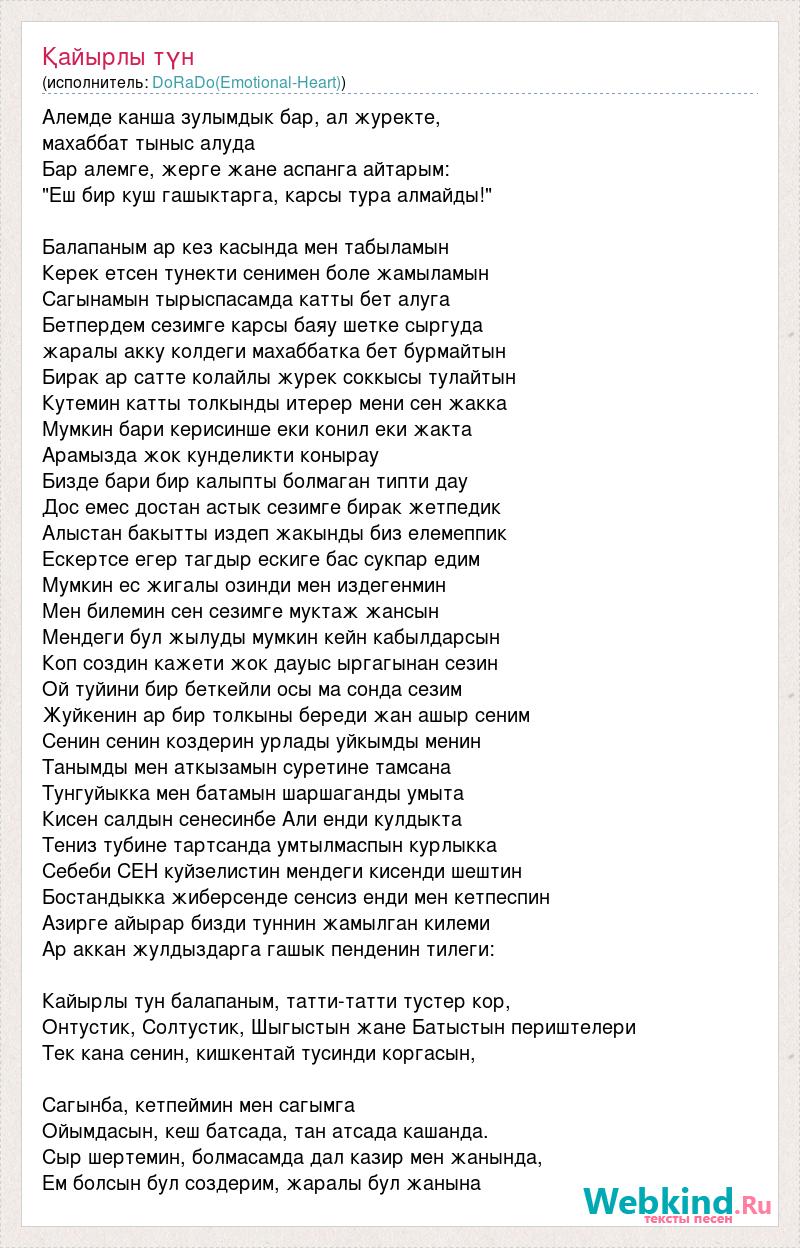 Алемде канша зулымдык бар, ал журекте, махаббат тыныс алуда Бар алемге, жерге жане аспанга айтарым: "Еш бир куш гашыктарга, карсы тура алмайды!" Балапаным ар кез касында мен табыламын Керек етсен тунекти сенимен боле жамыламын Сагынамын тырыспасамда катты бет алуга Бетпердем сезимге карсы баяу шетке сыргуда жаралы акку колдеги махаббатка бет бурмайтын Бирак ар сатте колайлы журек соккысы тулайтын Кутемин катты толкынды итерер мени сен жакка Мумкин бари керисинше еки конил еки жакта Арамызда жок кунделикти конырау Бизде бари бир калыпты болмаган типти дау Дос емес достан астык сезимге бирак жетпедик Алыстан бакытты издеп жакынды биз елемеппик Ескертcе егер тагдыр ескиге бас сукпар едим Мумкин ес жигалы озинди мен издегенмин Мен билемин сен сезимге муктаж жансын Мендеги бул жылуды мумкин кейн кабылдарсын Коп создин кажети жок дауыс ыргагынан сезин Ой туйини бир беткейли осы ма сонда сезим Жуйкенин ар бир толкыны береди жан ашыр сеним Сенин сенин коздерин урлады уйкымды менин Танымды мен аткызамын суретине тамсана Тунгуйыкка мен батамын шаршаганды умыта Кисен салдын сенесинбе Али енди кулдыкта Тениз тубине тартсанда умтылмаспын курлыкка Себеби СЕН куйзелистин мендеги кисенди шештин Бостандыкка жиберсенде сенсиз енди мен кетпеспин Азирге айырар бизди туннин жамылган килеми Ар аккан жулдыздарга гашык пенденин тилеги: Кайырлы тун балапаным, татти-татти тустер кор, Онтустик, Солтустик, Шыгыстын жане Батыстын периштелери Тек кана сенин, кишкентай тусинди коргасын, Сагынба, кетпеймин мен сагымга Ойымдасын, кеш батсада, тан атсада кашанда. Сыр шертемин, болмасамда дал казир мен жанында, Ем болсын бул создерим, жаралы бул жанына