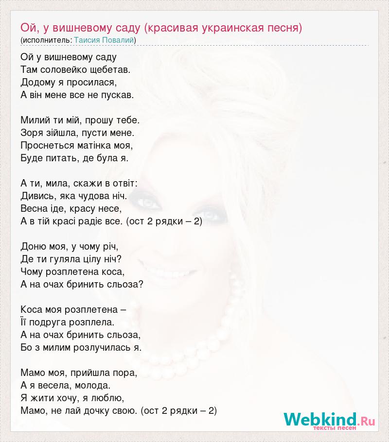 Ой у вишневому саду Там соловейко щебетав. Додому я просилася, А він мене все не пускав. Милий ти мій, прошу тебе. Зоря зійшла, пусти мене. Проснеться матінка моя, Буде питать, де була я. А ти, мила, скажи в отвіт: Дивись, яка чудова ніч. Весна іде, красу несе, А в тій красі радіє все. (ост 2 рядки – 2) Доню моя, у чому річ, Де ти гуляла цілу ніч? Чому розплетена коса, А на очах бринить сльоза? Коса моя розплетена – Її подруга розплела. А на очах бринить сльоза, Бо з милим розлучилась я. Мамо моя, прийшла пора, А я весела, молода. Я жити хочу, я люблю, Мамо, не лай дочку свою. (ост 2 рядки – 2)