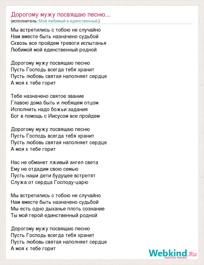 Мы встретились с тобою не случайно Нам вместе быть назначено судьбой Сквозь все пройдем тревоги испытанья Любимой мой единственный родной Дорогому мужу посвящаю песню Пусть Господь всегда тебя хранит Пусть любовь святая наполняет сердце А моя к тебе горит Тебе назначено святое звание Главою дома быть и любящем отцом Исполнить надо божьи задания Бог в помощь с Иисусом все пройдем Дорогому мужу посвящаю песню Пусть Господь всегда тебя хранит Пусть любовь святая наполняет сердце А моя к тебе горит Нас не обманет лживый ангел света Ему не отдадим свою семью Пусть наши дети будущее встретят Служа от сердца Господу-царю Мы встретились с тобою не случайно Нам вместе быть назначено судьбой Мы есть одно дыханье плоть сознание Ты мой герой единственный родной Дорогому мужу посвящаю песню Пусть Господь всегда тебя хранит Пусть любовь святая наполняет сердце А моя к тебе горит