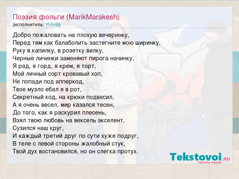 Добро пожаловать на плохую вечеринку, Перед тем как балаболить застегните мою ширинку, Руку в капилку, в розетку вилку, Черные личинки заменяют пирога начинку, Я рад, я горд, я крем, я торт, Мой личный сорт кровавый хоп, Не попади под апперкод, Твое музло ебал я в рот, Секретный код, на крюки подвесил, А я очень весел, мир казался тесен, До того, как я раскурил плесень, Взял твою любовь на вексель экселент, Сузился наш круг, И каждый третий друг по сути хуже подруг, В теле с левой стороны жалобный стук, Твой дух востановился, но он слегка протух.
