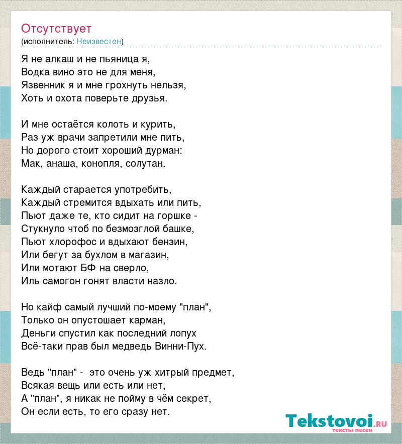 Я не алкаш и не пьяница я, Водка вино это не для меня, Язвенник я и мне грохнуть нельзя, Хоть и охота поверьте друзья. И мне остаётся колоть и курить, Раз уж врачи запретили мне пить, Но дорого стоит хороший дурман: Мак, анаша, конопля, солутан. Каждый старается употребить, Каждый стремится вдыхать или пить, Пьют даже те, кто сидит на горшке - Стукнуло чтоб по безмозглой башке, Пьют хлорофос и вдыхают бензин, Или бегут за бухлом в магазин, Или мотают БФ на сверло, Иль самогон гонят власти назло. Но кайф самый лучший по-моему "план", Только он опустошает карман, Деньги спустил как последний лопух Всё-таки прав был медведь Винни-Пух. Ведь "план" - это очень уж хитрый предмет, Всякая вещь или есть или нет, А "план", я никак не пойму в чём секрет, Он если есть, то его сразу нет.