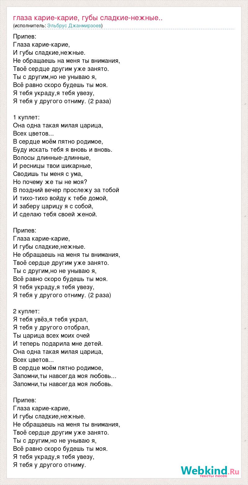Припев: Глаза карие-карие, И губы сладкие,нежные. Не обращаешь на меня ты внимания, Твоё сердце другим уже занято. Ты с другим,но не унываю я, Всё равно скоро будешь ты моя. Я тебя украду,я тебя увезу, Я тебя у другого отниму. (2 раза) 1 куплет: Она одна такая милая царица, Всех цветов... В сердце моём пятно родимое, Буду искать тебя я вновь и вновь. Волосы длинные-длинные, И ресницы твои шикарные, Сводишь ты меня с ума, Но почему же ты не моя? В поздний вечер прослежу за тобой И тихо-тихо войду к тебе домой, И заберу царицу я с собой, И сделаю тебя своей женой. Припев: Глаза карие-карие, И губы сладкие,нежные. Не обращаешь на меня ты внимания, Твоё сердце другим уже занято. Ты с другим,но не унываю я, Всё равно скоро будешь ты моя. Я тебя украду,я тебя увезу, Я тебя у другого отниму. (2 раза) 2 куплет: Я тебя увёз,я тебя украл, Я тебя у другого отобрал, Ты царица всех моих очей И теперь подарила мне детей. Она одна такая милая царица, Всех цветов... В сердце моём пятно родимое, Запомни,ты навсегда моя любовь... Запомни,ты навсегда моя любовь. Припев: Глаза карие-карие, И губы сладкие,нежные. Не обращаешь на меня ты внимания, Твоё сердце другим уже занято. Ты с другим,но не унываю я, Всё равно скоро будешь ты моя. Я тебя украду,я тебя увезу, Я тебя у другого отниму.