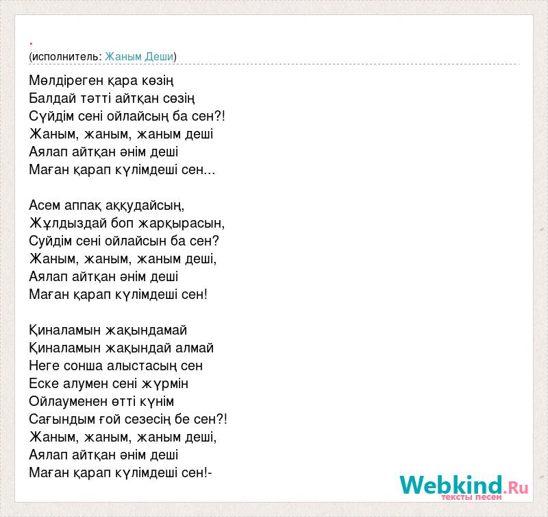 Мөлдіреген қара көзің Балдай тәтті айтқан сөзің Сүйдім сені ойлайсың ба сен?! Жаным, жаным, жаным деші Аялап айтқан әнім деші Маған қарап күлімдеші сен... Асем аппақ аққудайсың, Жұлдыздай боп жарқырасын, Суйдiм сенi ойлайсын ба сен? Жаным, жаным, жаным деші, Аялап айтқан әнім деші Маған қарап күлімдеші сен! Қиналамын жақындамай Қиналамын жақындай алмай Неге сонша алыстасың сен Еске алумен сені жүрмін Ойлауменен өтті күнім Сағындым ғой сезесің бе сен?! Жаным, жаным, жаным деші, Аялап айтқан әнім деші Маған қарап күлімдеші сен!-