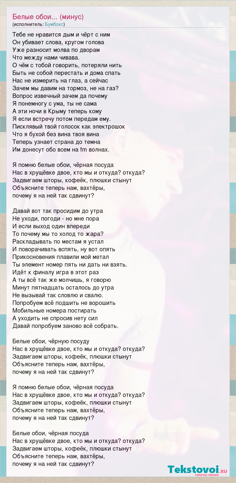 Тебе не нравится дым и чёрт с ним Он убивает слова, кругом голова Уже разносит молва по дворам Что между нами чивава. О чём с тобой говорить, потеряли нить Быть не собой перестать и дома спать Нас не измерить на глаз, а сейчас Зачем мы давим на тормоз, не на газ? Вопрос извечный зачем да почему Я понемногу с ума, ты не сама А эти ночи в Крыму теперь кому Я если встречу потом передам ему. Писклявый твой голосок как электрошок Что я бухой без вина твоя вина Теперь узнает страна до темна Им донесут обо всем на fm волнах. Я помню белые обои, чёрная посуда Нас в хрущёвке двое, кто мы и откуда? откуда? Задвигаем шторы, кофеёк, плюшки стынут Объясните теперь нам, вахтёры, почему я на ней так сдвинут? Давай вот так просидим до утра Не уходи, погоди - но мне пора И если выход один впереди То почему мы то холод то жара? Раскладывать по местам я устал И поворачивать вспять, ну вот опять Прикосновения плавили мой метал Ты элемент номер пять ни дать ни взять. Идёт к финалу игра в этот раз А ты всё так же молчишь, я говорю Минут пятнадцать осталось до утра Не вызывай так словлю и свалю. Попробуем всё подшить не ворошить Мобильные номера постирать А уходить не спросив нету сил Давай попробуем заново всё собрать. Белые обои, чёрную посуду Нас в хрущёвке двое, кто мы и откуда? откуда? Задвигаем шторы, кофеёк, плюшки стынут Объясните теперь нам, вахтёры, почему я на ней так сдвинут? Я помню белые обои, чёрная посуда Нас в хрущёвке двое, кто мы и откуда? откуда? Задвигаем шторы, кофеёк, плюшки стынут Объясните теперь нам, вахтёры, почему я на ней так сдвинут? Белые обои, чёрная посуда Нас в хрущёвке двое, кто мы и откуда? откуда? Задвигаем шторы, кофеёк, плюшки стынут Объясните теперь нам, вахтёры, почему я на ней так сдвинут?