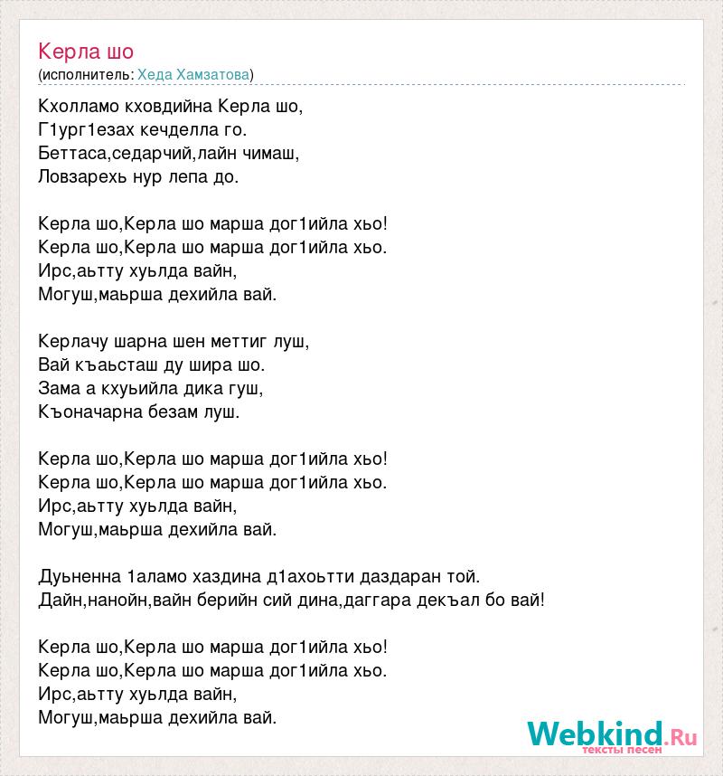 Кхолламо кховдийна Керла шо, Г1ург1езах кечделла го. Беттаса,седарчий,лайн чимаш, Ловзарехь нур лепа до. Керла шо,Керла шо марша дог1ийла хьо! Керла шо,Керла шо марша дог1ийла хьо. Ирс,аьтту хуьлда вайн, Могуш,маьрша дехийла вай. Керлачу шарна шен меттиг луш, Вай къаьсташ ду шира шо. Зама а кхуьийла дика гуш, Къоначарна безам луш. Керла шо,Керла шо марша дог1ийла хьо! Керла шо,Керла шо марша дог1ийла хьо. Ирс,аьтту хуьлда вайн, Могуш,маьрша дехийла вай. Дуьненна 1аламо хаздина д1ахоьтти даздаран той. Дайн,нанойн,вайн берийн сий дина,даггара декъал бо вай! Керла шо,Керла шо марша дог1ийла хьо! Керла шо,Керла шо марша дог1ийла хьо. Ирс,аьтту хуьлда вайн, Могуш,маьрша дехийла вай.