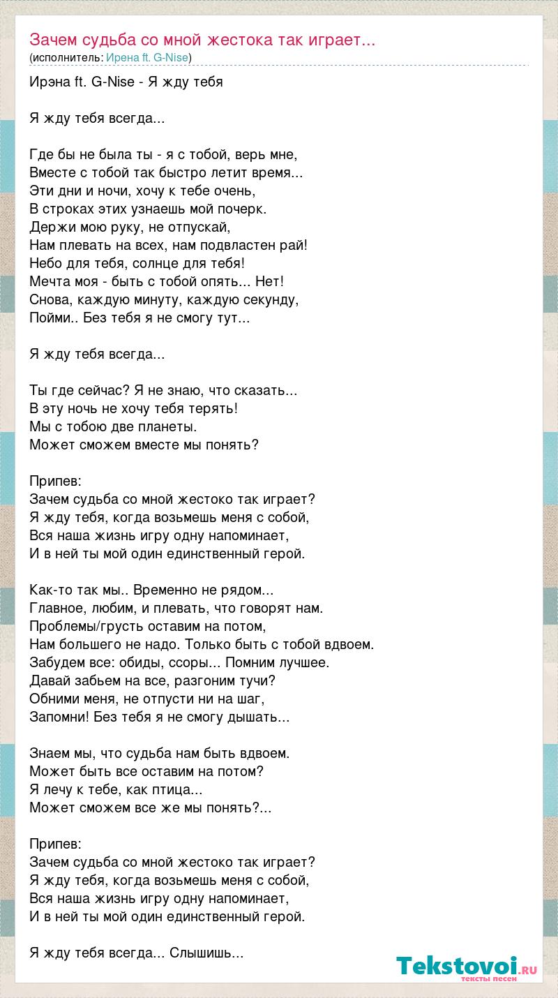 Ирэна ft. G-Nise - Я жду тебя Я жду тебя всегда... Где бы не была ты - я с тобой, верь мне, Вместе с тобой так быстро летит время... Эти дни и ночи, хочу к тебе очень, В строках этих узнаешь мой почерк. Держи мою руку, не отпускай, Нам плевать на всех, нам подвластен рай! Небо для тебя, солнце для тебя! Мечта моя - быть с тобой опять... Нет! Снова, каждую минуту, каждую секунду, Пойми.. Без тебя я не смогу тут... Я жду тебя всегда... Ты где сейчас? Я не знаю, что сказать... В эту ночь не хочу тебя терять! Мы с тобою две планеты. Может сможем вместе мы понять? Припев: Зачем судьба со мной жестоко так играет? Я жду тебя, когда возьмешь меня с собой, Вся наша жизнь игру одну напоминает, И в ней ты мой один единственный герой. Как-то так мы.. Временно не рядом... Главное, любим, и плевать, что говорят нам. Проблемы/грусть оставим на потом, Нам большего не надо. Только быть с тобой вдвоем. Забудем все: обиды, ссоры... Помним лучшее. Давай забьем на все, разгоним тучи? Обними меня, не отпусти ни на шаг, Запомни! Без тебя я не смогу дышать... Знаем мы, что судьба нам быть вдвоем. Может быть все оставим на потом? Я лечу к тебе, как птица... Может сможем все же мы понять?... Припев: Зачем судьба со мной жестоко так играет? Я жду тебя, когда возьмешь меня с собой, Вся наша жизнь игру одну напоминает, И в ней ты мой один единственный герой. Я жду тебя всегда... Слышишь...
