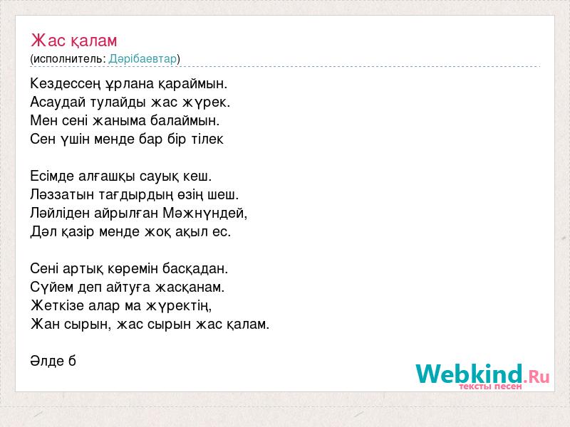Кездессең ұрлана қараймын. Асаудай тулайды жас жүрек. Мен сені жаныма балаймын. Сен үшін менде бар бір тілек Есімде алғашқы сауық кеш. Ләззатын тағдырдың өзің шеш. Ләйліден айрылған Мәжнүндей, Дәл қазір менде жоқ ақыл ес. Сені артық көремін басқадан. Сүйем деп айтуға жасқанам. Жеткізе алар ма жүректің, Жан сырын, жас сырын жас қалам. Әлде б