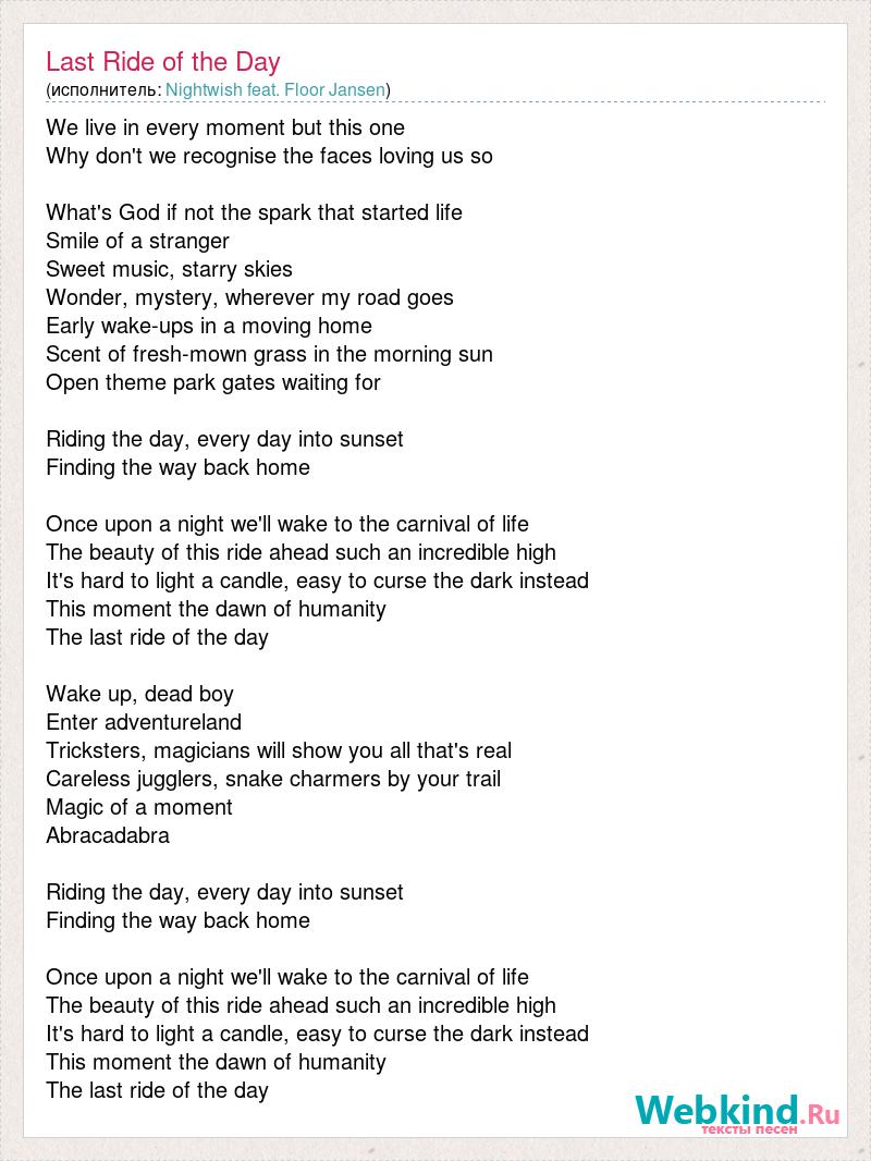 We live in every moment but this one Why don't we recognise the faces loving us so What's God if not the spark that started life Smile of a stranger Sweet music, starry skies Wonder, mystery, wherever my road goes Early wake-ups in a moving home Scent of fresh-mown grass in the morning sun Open theme park gates waiting for Riding the day, every day into sunset Finding the way back home Once upon a night we'll wake to the carnival of life The beauty of this ride ahead such an incredible high It's hard to light a candle, easy to curse the dark instead This moment the dawn of humanity The last ride of the day Wake up, dead boy Enter adventureland Tricksters, magicians will show you all that's real Careless jugglers, snake charmers by your trail Magic of a moment Abracadabra Riding the day, every day into sunset Finding the way back home Once upon a night we'll wake to the carnival of life The beauty of this ride ahead such an incredible high It's hard to light a candle, easy to curse the dark instead This moment the dawn of humanity The last ride of the day