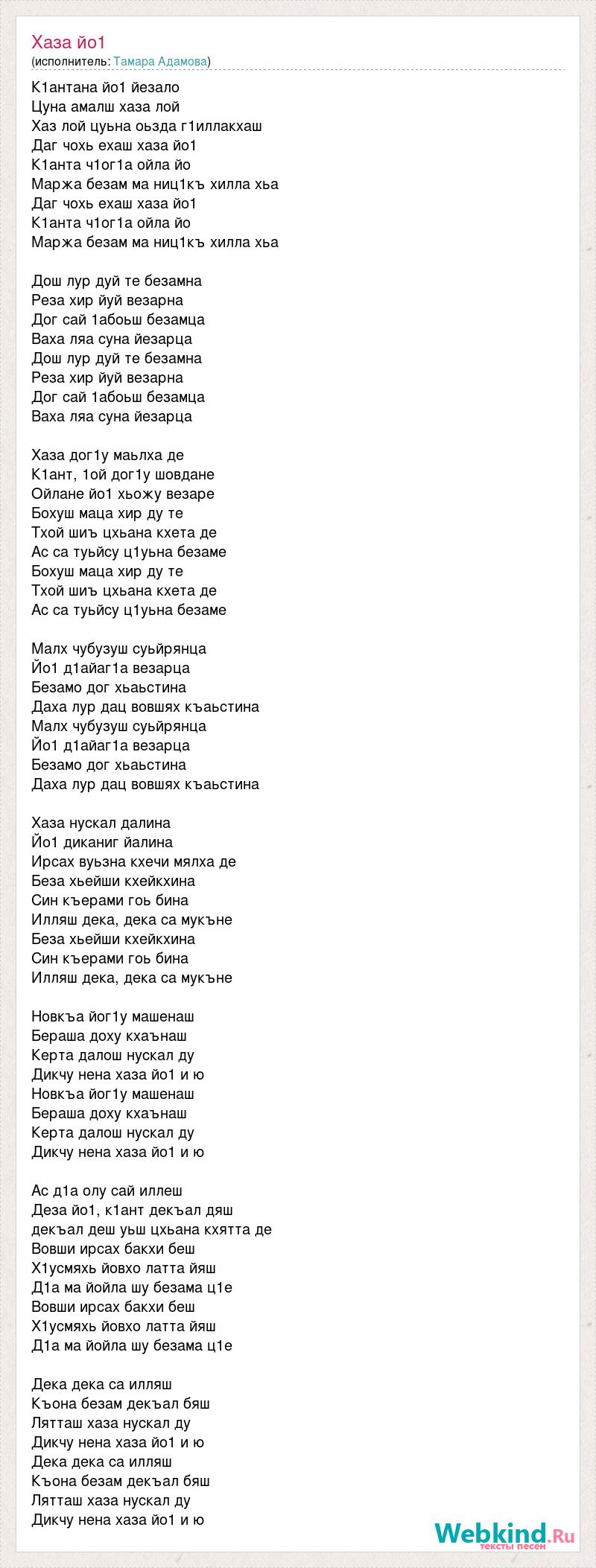 К1антана йо1 йезало Цуна амалш хаза лой Хаз лой цуьна оьзда г1иллакхаш Даг чохь ехаш хаза йо1 К1анта ч1ог1а ойла йо Маржа безам ма ниц1къ хилла хьа Даг чохь ехаш хаза йо1 К1анта ч1ог1а ойла йо Маржа безам ма ниц1къ хилла хьа Дош лур дуй те безамна Реза хир йуй везарна Дог сай 1абоьш безамца Ваха ляа суна йезарца Дош лур дуй те безамна Реза хир йуй везарна Дог сай 1абоьш безамца Ваха ляа суна йезарца Хаза дог1у маьлха де К1ант, 1ой дог1у шовдане Ойлане йо1 хьожу везаре Бохуш маца хир ду те Тхой шиъ цхьана кхета де Ас са туьйсу ц1уьна безаме Бохуш маца хир ду те Тхой шиъ цхьана кхета де Ас са туьйсу ц1уьна безаме Малх чубузуш суьйрянца Йо1 д1айаг1а везарца Безамо дог хьаьстина Даха лур дац вовшях къаьстина Малх чубузуш суьйрянца Йо1 д1айаг1а везарца Безамо дог хьаьстина Даха лур дац вовшях къаьстина Хаза нускал далина Йо1 диканиг йалина Ирсах вуьзна кхечи мялха де Беза хьейши кхейкхина Син къерами гоь бина Илляш дека, дека са мукъне Беза хьейши кхейкхина Син къерами гоь бина Илляш дека, дека са мукъне Новкъа йог1у машенаш Бераша доху кхаънаш Керта далош нускал ду Дикчу нена хаза йо1 и ю Новкъа йог1у машенаш Бераша доху кхаънаш Керта далош нускал ду Дикчу нена хаза йо1 и ю Ас д1а олу сай иллеш Деза йо1, к1ант декъал дяш декъал деш уьш цхьана кхятта де Вовши ирсах бакхи беш Х1усмяхь йовхо латта йяш Д1а ма йойла шу безама ц1е Вовши ирсах бакхи беш Х1усмяхь йовхо латта йяш Д1а ма йойла шу безама ц1е Дека дека са илляш Къона безам декъал бяш Лятташ хаза нускал ду Дикчу нена хаза йо1 и ю Дека дека са илляш Къона безам декъал бяш Лятташ хаза нускал ду Дикчу нена хаза йо1 и ю