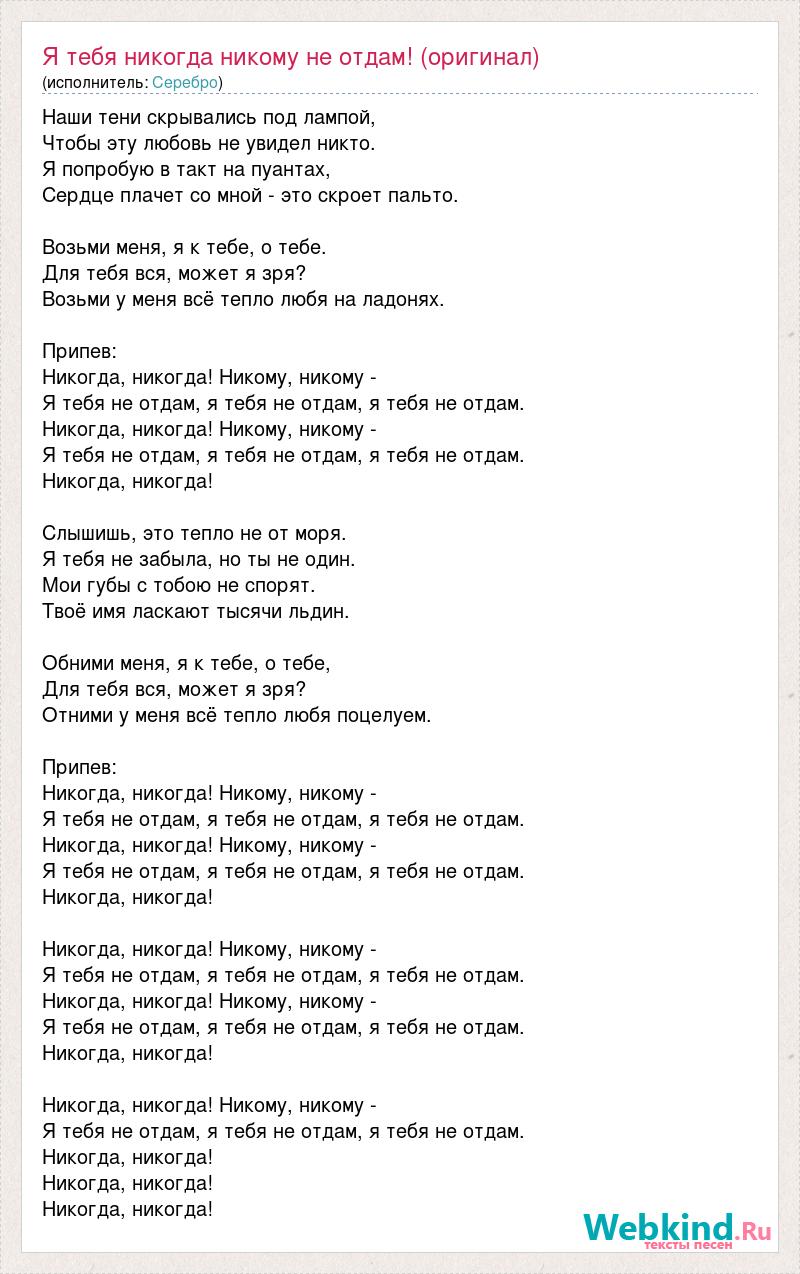 Наши тени скрывались под лампой, Чтобы эту любовь не увидел никто. Я попробую в такт на пуантах, Сердце плачет со мной - это скроет пальто. Возьми меня, я к тебе, о тебе. Для тебя вся, может я зря? Возьми у меня всё тепло любя на ладонях. Припев: Никогда, никогда! Никому, никому - Я тебя не отдам, я тебя не отдам, я тебя не отдам. Никогда, никогда! Никому, никому - Я тебя не отдам, я тебя не отдам, я тебя не отдам. Никогда, никогда! Слышишь, это тепло не от моря. Я тебя не забыла, но ты не один. Мои губы с тобою не спорят. Твоё имя ласкают тысячи льдин. Обними меня, я к тебе, о тебе, Для тебя вся, может я зря? Отними у меня всё тепло любя поцелуем. Припев: Никогда, никогда! Никому, никому - Я тебя не отдам, я тебя не отдам, я тебя не отдам. Никогда, никогда! Никому, никому - Я тебя не отдам, я тебя не отдам, я тебя не отдам. Никогда, никогда! Никогда, никогда! Никому, никому - Я тебя не отдам, я тебя не отдам, я тебя не отдам. Никогда, никогда! Никому, никому - Я тебя не отдам, я тебя не отдам, я тебя не отдам. Никогда, никогда! Никогда, никогда! Никому, никому - Я тебя не отдам, я тебя не отдам, я тебя не отдам. Никогда, никогда! Никогда, никогда! Никогда, никогда!