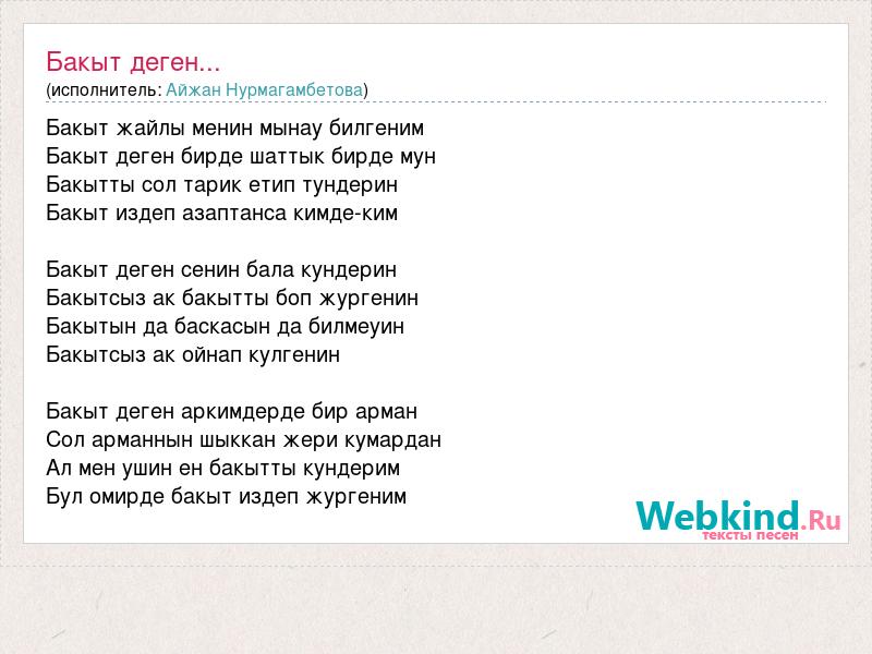 Бакыт жайлы менин мынау билгеним Бакыт деген бирде шаттык бирде мун Бакытты сол тарик етип тундерин Бакыт издеп азаптанса кимде-ким Бакыт деген сенин бала кундерин Бакытсыз ак бакытты боп жургенин Бакытын да баскасын да билмеуин Бакытсыз ак ойнап кулгенин Бакыт деген аркимдерде бир арман Сол арманнын шыккан жери кумардан Ал мен ушин ен бакытты кундерим Бул омирде бакыт издеп жургеним