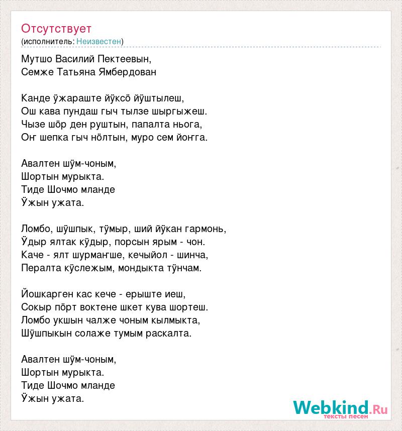 Мутшо Василий Пектеевын, Семже Татьяна Ямбердован Канде ӱжараште йӱксӧ йӱштылеш, Ош кава пундаш гыч тылзе шыргыжеш. Чызе шӧр ден руштын, папалта ньога, Оҥ шепка гыч нӧлтын, муро сем йоҥга. Авалтен шӱм-чоным, Шортын мурыкта. Тиде Шочмо мланде Ӱжын ужата. Ломбо, шӱшпык, тӱмыр, ший йӱкан гармонь, Ӱдыр ялтак кӱдыр, порсын ярым - чон. Каче - ялт шурмаҥше, кечыйол - шинча, Пералта кӱслежым, мондыкта тӱнчам. Йошкарген кас кече - ерыште иеш, Сокыр пӧрт воктене шкет кува шортеш. Ломбо укшын чалже чоным кылмыкта, Шӱшпыкын солаже тумым раскалта. Авалтен шӱм-чоным, Шортын мурыкта. Тиде Шочмо мланде Ӱжын ужата.