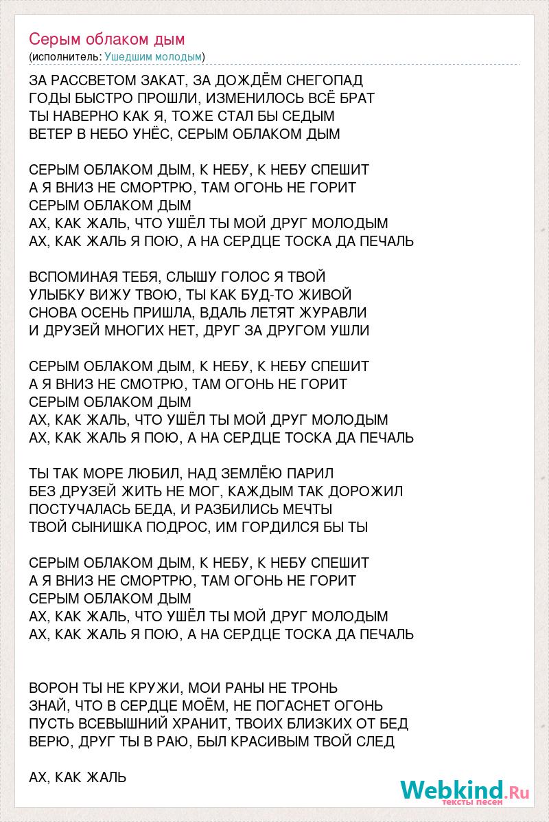ЗА РАССВЕТОМ ЗАКАТ, ЗА ДОЖДЁМ СНЕГОПАД ГОДЫ БЫСТРО ПРОШЛИ, ИЗМЕНИЛОСЬ ВСЁ БРАТ ТЫ НАВЕРНО КАК Я, ТОЖЕ СТАЛ БЫ СЕДЫМ ВЕТЕР В НЕБО УНЁС, СЕРЫМ ОБЛАКОМ ДЫМ СЕРЫМ ОБЛАКОМ ДЫМ, К НЕБУ, К НЕБУ СПЕШИТ А Я ВНИЗ НЕ СМОРТРЮ, ТАМ ОГОНЬ НЕ ГОРИТ СЕРЫМ ОБЛАКОМ ДЫМ АХ, КАК ЖАЛЬ, ЧТО УШЁЛ ТЫ МОЙ ДРУГ МОЛОДЫМ АХ, КАК ЖАЛЬ Я ПОЮ, А НА СЕРДЦЕ ТОСКА ДА ПЕЧАЛЬ ВСПОМИНАЯ ТЕБЯ, СЛЫШУ ГОЛОС Я ТВОЙ УЛЫБКУ ВИЖУ ТВОЮ, ТЫ КАК БУД-ТО ЖИВОЙ СНОВА ОСЕНЬ ПРИШЛА, ВДАЛЬ ЛЕТЯТ ЖУРАВЛИ И ДРУЗЕЙ МНОГИХ НЕТ, ДРУГ ЗА ДРУГОМ УШЛИ СЕРЫМ ОБЛАКОМ ДЫМ, К НЕБУ, К НЕБУ СПЕШИТ А Я ВНИЗ НЕ СМОТРЮ, ТАМ ОГОНЬ НЕ ГОРИТ СЕРЫМ ОБЛАКОМ ДЫМ АХ, КАК ЖАЛЬ, ЧТО УШЁЛ ТЫ МОЙ ДРУГ МОЛОДЫМ АХ, КАК ЖАЛЬ Я ПОЮ, А НА СЕРДЦЕ ТОСКА ДА ПЕЧАЛЬ ТЫ ТАК МОРЕ ЛЮБИЛ, НАД ЗЕМЛЁЮ ПАРИЛ БЕЗ ДРУЗЕЙ ЖИТЬ НЕ МОГ, КАЖДЫМ ТАК ДОРОЖИЛ ПОСТУЧАЛАСЬ БЕДА, И РАЗБИЛИСЬ МЕЧТЫ ТВОЙ СЫНИШКА ПОДРОС, ИМ ГОРДИЛСЯ БЫ ТЫ СЕРЫМ ОБЛАКОМ ДЫМ, К НЕБУ, К НЕБУ СПЕШИТ А Я ВНИЗ НЕ СМОРТРЮ, ТАМ ОГОНЬ НЕ ГОРИТ СЕРЫМ ОБЛАКОМ ДЫМ АХ, КАК ЖАЛЬ, ЧТО УШЁЛ ТЫ МОЙ ДРУГ МОЛОДЫМ АХ, КАК ЖАЛЬ Я ПОЮ, А НА СЕРДЦЕ ТОСКА ДА ПЕЧАЛЬ ВОРОН ТЫ НЕ КРУЖИ, МОИ РАНЫ НЕ ТРОНЬ ЗНАЙ, ЧТО В СЕРДЦЕ МОЁМ, НЕ ПОГАСНЕТ ОГОНЬ ПУСТЬ ВСЕВЫШНИЙ ХРАНИТ, ТВОИХ БЛИЗКИХ ОТ БЕД ВЕРЮ, ДРУГ ТЫ В РАЮ, БЫЛ КРАСИВЫМ ТВОЙ СЛЕД АХ, КАК ЖАЛЬ