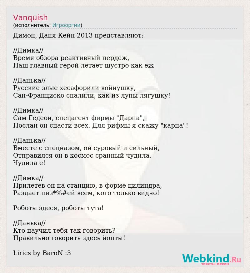 Димон, Даня Кейн 2013 представляют: //Димка// Время обзора реактивный пердеж, Наш главный герой летает шустро как еж //Данька// Русские злые хесафорили войнушку, Сан-Франциско спалили, как из лупы лягушку! //Димка// Сам Гедеон, спецагент фирмы "Дарпа", Послан он спасти всех. Для рифмы я скажу "карпа"! //Данька// Вместе с спецназом, он суровый и сильный, Отправился он в космос сранный чудила. Чудила е! //Димка// Прилетев он на станцию, в форме цилиндра, Раздает пиз*%#ей всем, кого только видно! Роботы здеся, роботы тута! //Данька// Кто научил тебя так говорить? Правильно говорить здесь йопты! Lirics by BaroN :3