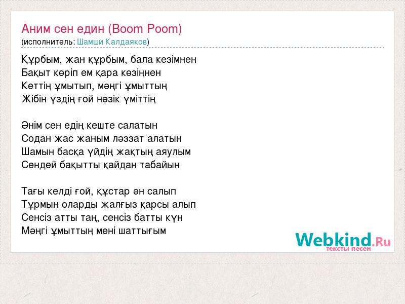 Құрбым, жан құрбым, бала кезімнен Бақыт көріп ем қара көзіңнен Кеттің ұмытып, мәңгі ұмыттың Жібін үздің ғой нәзік үміттің Әнім сен едің кеште салатын Содан жас жаным ләззат алатын Шамын басқа үйдің жақтың аяулым Сендей бақытты қайдан табайын Тағы келді ғой, құстар ән салып Тұрмын оларды жалғыз қарсы алып Сенсіз атты таң, сенсіз батты күн Мәңгі ұмыттың мені шаттығым
