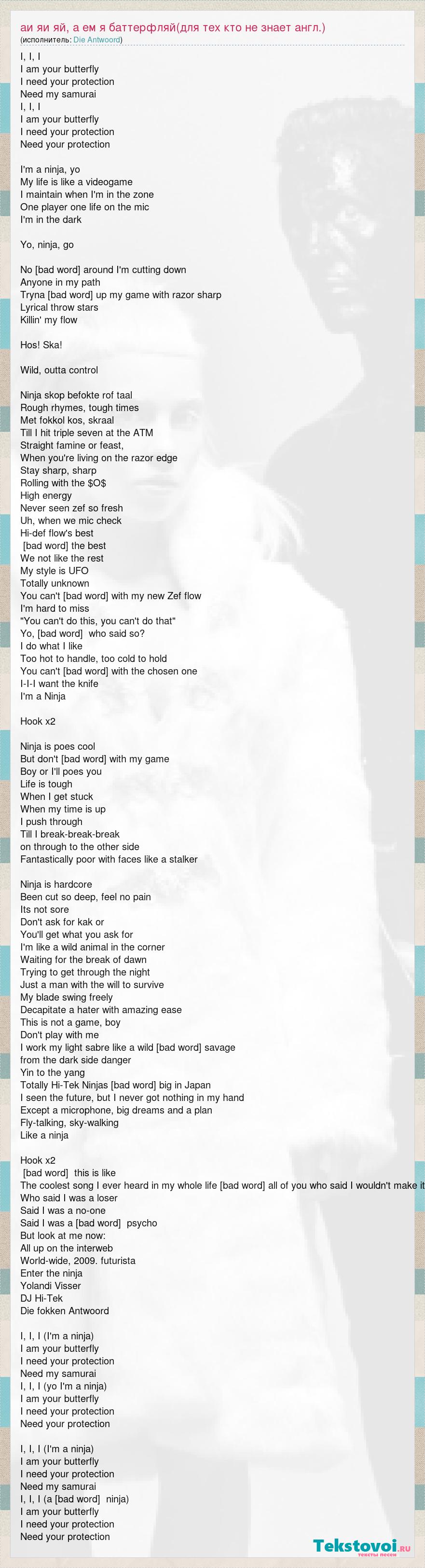 I, I, I I am your butterfly I need your protection Need my samurai I, I, I I am your butterfly I need your protection Need your protection I'm a ninja, yo My life is like a videogame I maintain when I'm in the zone One player one life on the mic I'm in the dark Yo, ninja, go No [bad word] around I'm cutting down Anyone in my path Tryna [bad word] up my game with razor sharp Lyrical throw stars Killin' my flow Hos! Ska! Wild, outta control Ninja skop befokte rof taal Rough rhymes, tough times Met fokkol kos, skraal Till I hit triple seven at the ATM Straight famine or feast, When you're living on the razor edge Stay sharp, sharp Rolling with the $O$ High energy Never seen zef so fresh Uh, when we mic check Hi-def flow's best [bad word] the best We not like the rest My style is UFO Totally unknown You can't [bad word] with my new Zef flow I'm hard to miss "You can't do this, you can't do that" Yo, [bad word] who said so? I do what I like Too hot to handle, too cold to hold You can't [bad word] with the chosen one I-I-I want the knife I'm a Ninja Hook x2 Ninja is poes cool But don't [bad word] with my game Boy or I'll poes you Life is tough When I get stuck When my time is up I push through Till I break-break-break on through to the other side Fantastically poor with faces like a stalker Ninja is hardcore Been cut so deep, feel no pain Its not sore Don't ask for kak or You'll get what you ask for I'm like a wild animal in the corner Waiting for the break of dawn Trying to get through the night Just a man with the will to survive My blade swing freely Decapitate a hater with amazing ease This is not a game, boy Don't play with me I work my light sabre like a wild [bad word] savage from the dark side danger Yin to the yang Totally Hi-Tek Ninjas [bad word] big in Japan I seen the future, but I never got nothing in my hand Except a microphone, big dreams and a plan Fly-talking, sky-walking Like a ninja Hook x2 [bad word] this is like The coolest song I ever heard in my whole life [bad word] all of you who said I wouldn't make it Who said I was a loser Said I was a no-one Said I was a [bad word] psycho But look at me now: All up on the interweb World-wide, 2009. futurista Enter the ninja Yolandi Visser DJ Hi-Tek Die fokken Antwoord I, I, I (I'm a ninja) I am your butterfly I need your protection Need my samurai I, I, I (yo I'm a ninja) I am your butterfly I need your protection Need your protection I, I, I (I'm a ninja) I am your butterfly I need your protection Need my samurai I, I, I (a [bad word] ninja) I am your butterfly I need your protection Need your protection