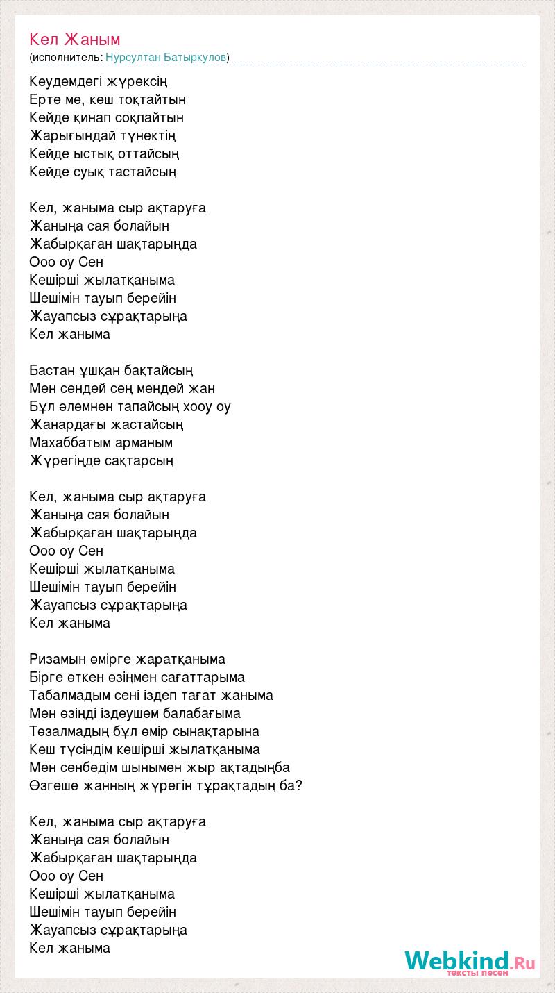 Кеудемдегі жүрексің Ерте ме, кеш тоқтайтын Кейде қинап соқпайтын Жарығындай түнектің Кейде ыстық оттайсың Кейде суық тастайсың Кел, жаныма сыр ақтаруға Жаныңа сая болайын Жабырқаған шақтарыңда Ооо оу Сен Кешірші жылатқаныма Шешімін тауып берейін Жауапсыз сұрақтарыңа Кел жаныма Бастан ұшқан бақтайсың Мен сендей сең мендей жан Бұл әлемнен тапайсың хооу оу Жанардағы жастайсың Махаббатым арманым Жүрегіңде сақтарсың Кел, жаныма сыр ақтаруға Жаныңа сая болайын Жабырқаған шақтарыңда Ооо оу Сен Кешірші жылатқаныма Шешімін тауып берейін Жауапсыз сұрақтарыңа Кел жаныма Ризамын өмірге жаратқаныма Бірге өткен өзіңмен сағаттарыма Табалмадым сені іздеп тағат жаныма Мен өзіңді іздеушем балабағыма Төзалмадың бұл өмір сынақтарына Кеш түсіндім кешірші жылатқаныма Мен сенбедім шынымен жыр ақтадыңба Өзгеше жанның жүрегін тұрақтадың ба? Кел, жаныма сыр ақтаруға Жаныңа сая болайын Жабырқаған шақтарыңда Ооо оу Сен Кешірші жылатқаныма Шешімін тауып берейін Жауапсыз сұрақтарыңа Кел жаныма