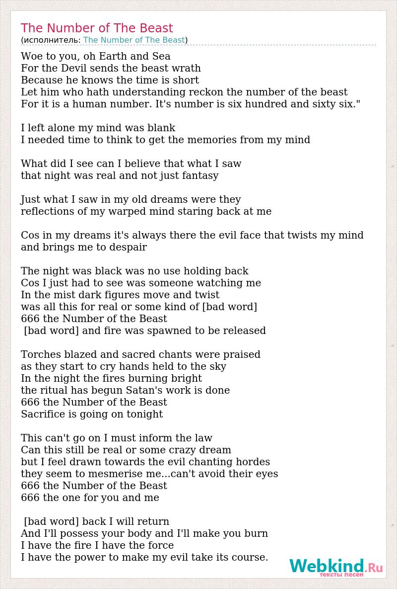 Woe to you, oh Earth and Sea For the Devil sends the beast wrath Because he knows the time is short Let him who hath understanding reckon the number of the beast For it is a human number. It's number is six hundred and sixty six." I left alone my mind was blank I needed time to think to get the memories from my mind What did I see can I believe that what I saw that night was real and not just fantasy Just what I saw in my old dreams were they reflections of my warped mind staring back at me Cos in my dreams it's always there the evil face that twists my mind and brings me to despair The night was black was no use holding back Cos I just had to see was someone watching me In the mist dark figures move and twist was all this for real or some kind of [bad word] 666 the Number of the Beast [bad word] and fire was spawned to be released Torches blazed and sacred chants were praised as they start to cry hands held to the sky In the night the fires burning bright the ritual has begun Satan's work is done 666 the Number of the Beast Sacrifice is going on tonight This can't go on I must inform the law Can this still be real or some crazy dream but I feel drawn towards the evil chanting hordes they seem to mesmerise me...can't avoid their eyes 666 the Number of the Beast 666 the one for you and me [bad word] back I will return And I'll possess your body and I'll make you burn I have the fire I have the force I have the power to make my evil take its course.