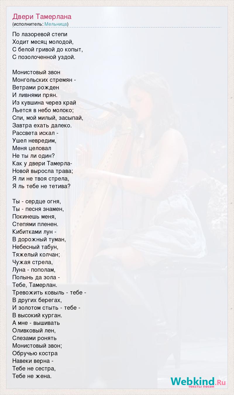 По лазоревой степи Ходит месяц молодой, С белой гривой до копыт, С позолоченной уздой. Монистовый звон Монгольских стремян - Ветрами рожден И ливнями прян. Из кувшина через край Льется в небо молоко; Спи, мой милый, засыпай, Завтра ехать далеко. Рассвета искал - Ушел невредим, Меня целовал Не ты ли один? Как у двери Тамерла- Новой выросла трава; Я ли не твоя стрела, Я ль тебе не тетива? Ты - сердце огня, Ты - песня знамен, Покинешь меня, Степями пленен. Кибитками лун - В дорожный туман, Небесный табун, Тяжелый колчан; Чужая стрела, Луна - пополам, Полынь да зола - Тебе, Тамерлан. Тревожить ковыль - тебе - В других берегах, И золотом стыть - тебе - В высокий курган. А мне - вышивать Оливковый лен, Слезами ронять Монистовый звон; Обручью костра Навеки верна - Тебе не сестра, Тебе не жена.