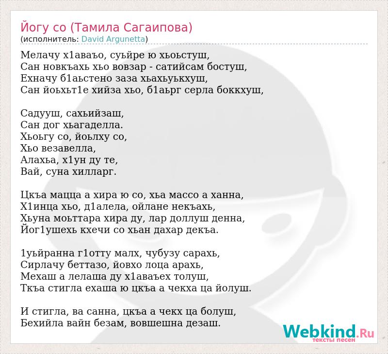 Мелачу х1аваъо, суьйре ю хьоьстуш, Сан новкъахь хьо вовзар - сатийсам бостуш, Ехначу б1аьстено заза хьахьуькхуш, Сан йоьхьт1е хийза хьо, б1аьрг серла боккхуш, Садууш, сахьийзаш, Сан дог хьагаделла. Хьоьгу со, йоьлху со, Хьо везавелла, Алахьа, х1ун ду те, Вай, суна хилларг. Цкъа мацца а хира ю со, хьа массо а ханна, Х1инца хьо, д1алела, ойлане некъахь, Хьуна моьттара хира ду, лар доллуш денна, Йог1ушехь кхечи со хьан дахар декъа. 1уьйранна г1отту малх, чубузу сарахь, Сирлачу беттазо, йовхо лоца арахь, Мехаш а лелаша ду х1аваъех толуш, Ткъа стигла ехаша ю цкъа а чекха ца йолуш. И стигла, ва санна, цкъа а чекх ца болуш, Бехийла вайн безам, вовшешна дезаш.