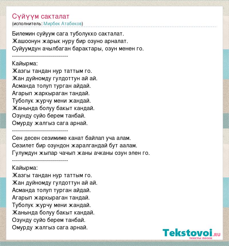Билемин суйуум сага туболукко сакталат. Жашоонун жарык нуру бир озуно арналат. Суйуумдун ачылбаган барактары, озун менен го. ---------------------------- Кайырма: Жазгы тандан нур таттым го. Жан дуйномду гулдоттун ай ай. Асманда толуп турган айдай. Агарып жаркыраган тандай. Туболук журчу мени жандай. Жанында болуу бакыт кандай. Озунду суйо берем танбай. Омурду жалгыз сага арнай. ---------------------------- Сен десен сезимиме канат байлап уча алам. Сезилет бир озундон жаралгандай бут аалам. Гулумдун жыпар чачып жаны ачканы озун элен го. ---------------------------- Кайырма: Жазгы тандан нур таттым го. Жан дуйномду гулдоттун ай ай. Асманда толуп турган айдай. Агарып жаркыраган тандай. Туболук журчу мени жандай. Жанында болуу бакыт кандай. Озунду суйо берем танбай. Омурду жалгыз сага арнай.