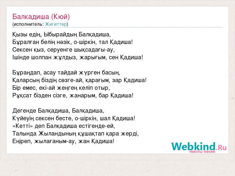 Қызы едің, Ыбырайдың Балқадиша, Бұралған белің нәзік, о-шіркін, тал Қадиша! Сексен қыз, серуенге шықсадағы-ау, Ішінде шолпан жұлдыз, жарығым, сен Қадиша! Бұраңдап, асау тайдай жүрген басың, Қаларсың біздің сөзге-ай, қарағым, зар Қадиша! Бір емес, екі-ай жеңгең келіп отыр, Рұқсат бізден сізге, жанарым, бар Қадиша! Дегенде Балқадиша, Балқадиша, Күйеуің сексен бесте, о-шіркін, шал Қадиша! «Кетті» деп Балқадиша естігенде-ей, Талында Жыландының құшақтап қара жерді, Еңіреп, жылағаным-ау, жан Қадиша!