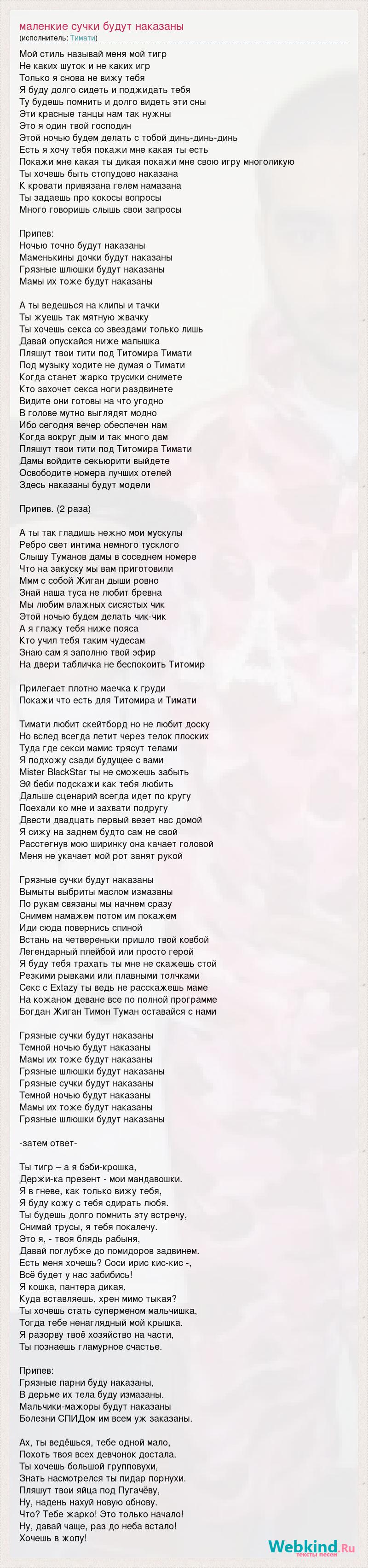 Мой стиль называй меня мой тигр Не каких шуток и не каких игр Только я снова не вижу тебя Я буду долго сидеть и поджидать тебя Ту будешь помнить и долго видеть эти сны Эти красные танцы нам так нужны Это я один твой господин Этой ночью будем делать с тобой динь-динь-динь Есть я хочу тебя покажи мне какая ты есть Покажи мне какая ты дикая покажи мне свою игру многоликую Ты хочешь быть стопудово наказана К кровати привязана гелем намазана Ты задаешь про кокосы вопросы Много говоришь слышь свои запросы Припев: Ночью точно будут наказаны Маменькины дочки будут наказаны Грязные шлюшки будут наказаны Мамы их тоже будут наказаны А ты ведешься на клипы и тачки Ты жуешь так мятную жвачку Ты хочешь секса со звездами только лишь Давай опускайся ниже малышка Пляшут твои тити под Титомира Тимати Под музыку ходите не думая о Тимати Когда станет жарко трусики снимете Кто захочет секса ноги раздвинете Видите они готовы на что угодно В голове мутно выглядят модно Ибо сегодня вечер обеспечен нам Когда вокруг дым и так много дам Пляшут твои тити под Титомира Тимати Дамы войдите секьюрити выйдете Освободите номера лучших отелей Здесь наказаны будут модели Припев. (2 раза) А ты так гладишь нежно мои мускулы Ребро свет интима немного тусклого Слышу Туманов дамы в соседнем номере Что на закуску мы вам приготовили Ммм с собой Жиган дыши ровно Знай наша туса не любит бревна Мы любим влажных сисястых чик Этой ночью будем делать чик-чик А я глажу тебя ниже пояса Кто учил тебя таким чудесам Знаю сам я заполню твой эфир На двери табличка не беспокоить Титомир Прилегает плотно маечка к груди Покажи что есть для Титомира и Тимати Тимати любит скейтборд но не любит доску Но вслед всегда летит через телок плоских Туда где секси мамис трясут телами Я подхожу сзади будущее с вами Mister BlackStar ты не сможешь забыть Эй беби подскажи как тебя любить Дальше сценарий всегда идет по кругу Поехали ко мне и захвати подругу Двести двадцать первый везет нас домой Я сижу на заднем будто сам не свой Расстегнув мою ширинку она качает головой Меня не укачает мой рот занят рукой Грязные сучки будут наказаны Вымыты выбриты маслом измазаны По рукам связаны мы начнем сразу Снимем намажем потом им покажем Иди сюда повернись спиной Встань на четвереньки пришло твой ковбой Легендарный плейбой или просто герой Я буду тебя трахать ты мне не скажешь стой Резкими рывками или плавными толчками Секс с Extazy ты ведь не расскажешь маме На кожаном деване все по полной программе Богдан Жиган Тимон Туман оставайся с нами Грязные сучки будут наказаны Темной ночью будут наказаны Мамы их тоже будут наказаны Грязные шлюшки будут наказаны Грязные сучки будут наказаны Темной ночью будут наказаны Мамы их тоже будут наказаны Грязные шлюшки будут наказаны -затем ответ- Ты тигр – а я бэби-крошка, Держи-ка презент - мои мандавошки. Я в гневе, как только вижу тебя, Я буду кожу с тебя сдирать любя. Ты будешь долго помнить эту встречу, Снимай трусы, я тебя покалечу. Это я, - твоя блядь рабыня, Давай поглубже до помидоров задвинем. Есть меня хочешь? Соси ирис кис-кис -, Всё будет у нас забибись! Я кошка, пантера дикая, Куда вставляешь, хрен мимо тыкая? Ты хочешь стать суперменом мальчишка, Тогда тебе ненаглядный мой крышка. Я разорву твоё хозяйство на части, Ты познаешь гламурное счастье. Припев: Грязные парни буду наказаны