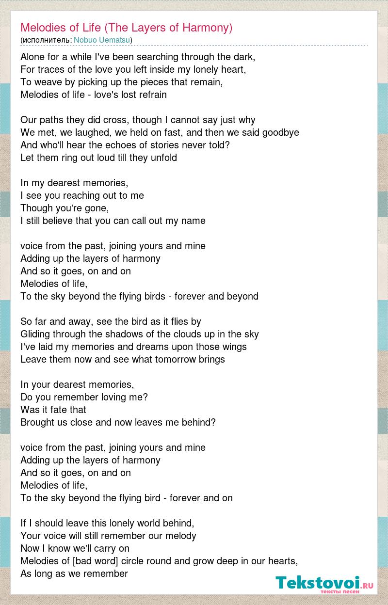 Alone for a while I've been searching through the dark, For traces of the love you left inside my lonely heart, To weave by picking up the pieces that remain, Melodies of life - love's lost refrain Our paths they did cross, though I cannot say just why We met, we laughed, we held on fast, and then we said goodbye And who'll hear the echoes of stories never told? Let them ring out loud till they unfold In my dearest memories, I see you reaching out to me Though you're gone, I still believe that you can call out my name voice from the past, joining yours and mine Adding up the layers of harmony And so it goes, on and on Melodies of life, To the sky beyond the flying birds - forever and beyond So far and away, see the bird as it flies by Gliding through the shadows of the clouds up in the sky I've laid my memories and dreams upon those wings Leave them now and see what tomorrow brings In your dearest memories, Do you remember loving me? Was it fate that Brought us close and now leaves me behind? voice from the past, joining yours and mine Adding up the layers of harmony And so it goes, on and on Melodies of life, To the sky beyond the flying bird - forever and on If I should leave this lonely world behind, Your voice will still remember our melody Now I know we'll carry on Melodies of life, Come circle round and grow deep in our hearts, As long as we remember
