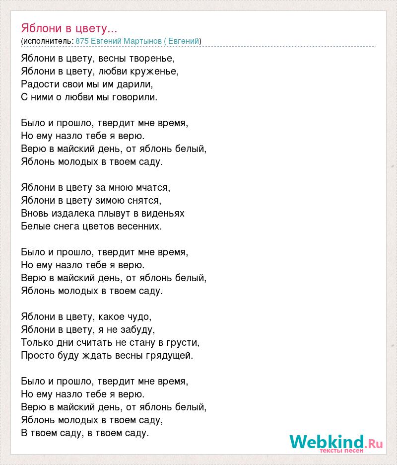 Яблони в цвету, весны творенье, Яблони в цвету, любви круженье, Радости свои мы им дарили, С ними о любви мы говорили. Было и прошло, твердит мне время, Но ему назло тебе я верю. Верю в майский день, от яблонь белый, Яблонь молодых в твоем саду. Яблони в цвету за мною мчатся, Яблони в цвету зимою снятся, Вновь издалека плывут в виденьях Белые снега цветов весенних. Было и прошло, твердит мне время, Но ему назло тебе я верю. Верю в майский день, от яблонь белый, Яблонь молодых в твоем саду. Яблони в цвету, какое чудо, Яблони в цвету, я не забуду, Только дни считать не стану в грусти, Просто буду ждать весны грядущей. Было и прошло, твердит мне время, Но ему назло тебе я верю. Верю в майский день, от яблонь белый, Яблонь молодых в твоем саду, В твоем саду, в твоем саду.
