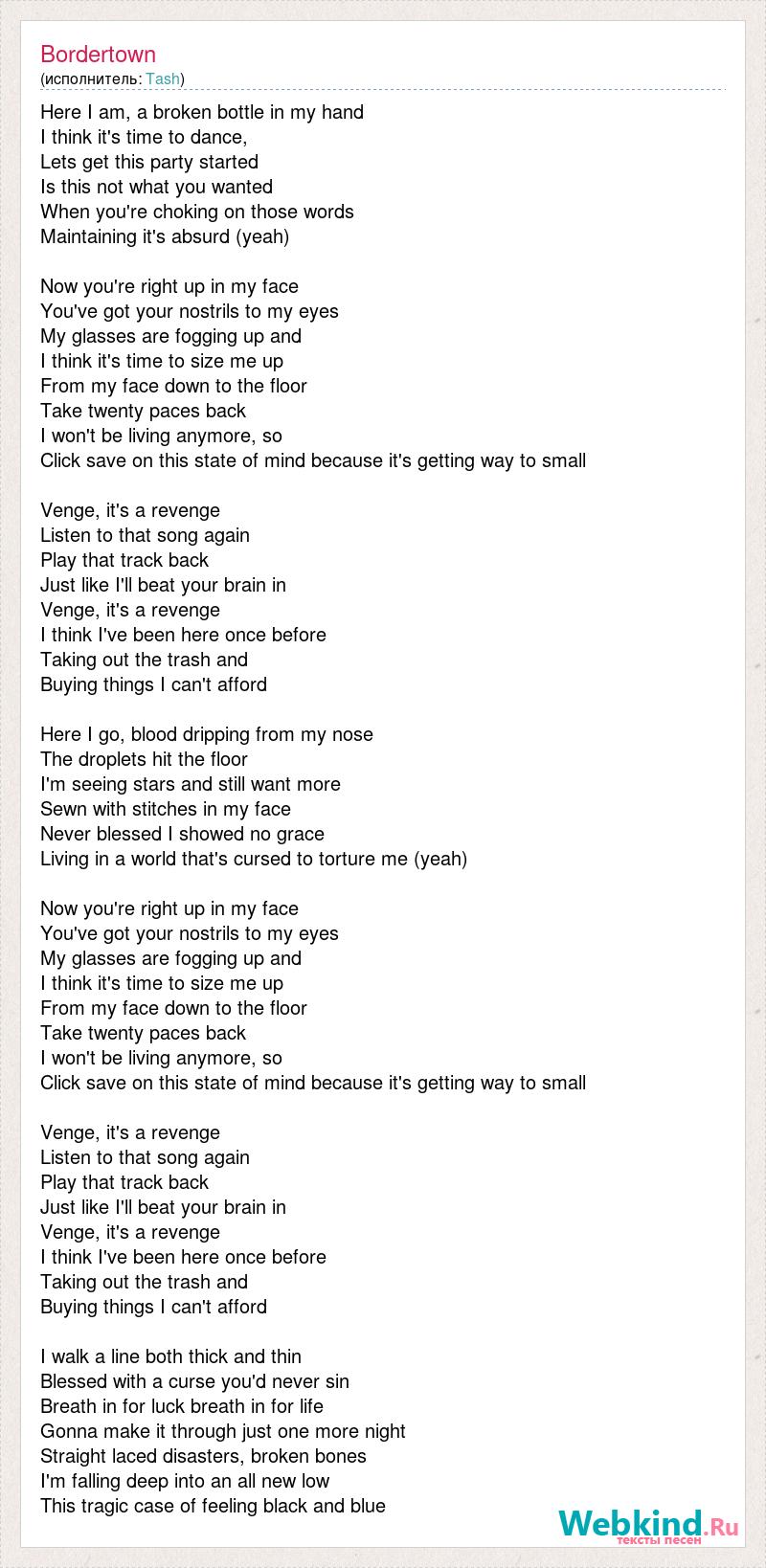 Here I am, a broken bottle in my hand I think it's time to dance, Lets get this party started Is this not what you wanted When you're choking on those words Maintaining it's absurd (yeah) Now you're right up in my face You've got your nostrils to my eyes My glasses are fogging up and I think it's time to size me up From my face down to the floor Take twenty paces back I won't be living anymore, so Click save on this state of mind because it's getting way to small Venge, it's a revenge Listen to that song again Play that track back Just like I'll beat your brain in Venge, it's a revenge I think I've been here once before Taking out the trash and Buying things I can't afford Here I go, blood dripping from my nose The droplets hit the floor I'm seeing stars and still want more Sewn with stitches in my face Never blessed I showed no grace Living in a world that's cursed to torture me (yeah) Now you're right up in my face You've got your nostrils to my eyes My glasses are fogging up and I think it's time to size me up From my face down to the floor Take twenty paces back I won't be living anymore, so Click save on this state of mind because it's getting way to small Venge, it's a revenge Listen to that song again Play that track back Just like I'll beat your brain in Venge, it's a revenge I think I've been here once before Taking out the trash and Buying things I can't afford I walk a line both thick and thin Blessed with a curse you'd never sin Breath in for luck breath in for life Gonna make it through just one more night Straight laced disasters, broken bones I'm falling deep into an all new low This tragic case of feeling black and blue