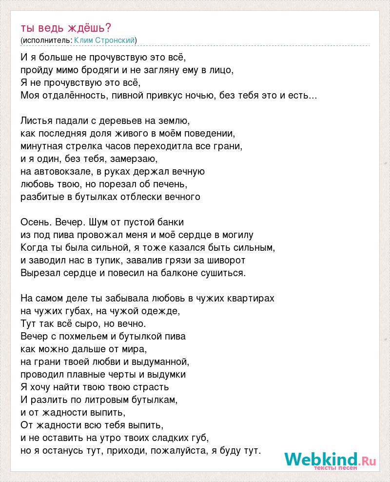 И я больше не прочувствую это всё, пройду мимо бродяги и не загляну ему в лицо, Я не прочувствую это всё, Моя отдалённость, пивной привкус ночью, без тебя это и есть... Листья падали с деревьев на землю, как последняя доля живого в моём поведении, минутная стрелка часов переходитла все грани, и я один, без тебя, замерзаю, на автовокзале, в руках держал вечную любовь твою, но порезал об печень, разбитые в бутылках отблески вечного Осень. Вечер. Шум от пустой банки из под пива провожал меня и моё сердце в могилу Когда ты была сильной, я тоже казался быть сильным, и заводил нас в тупик, завалив грязи за шиворот Вырезал сердце и повесил на балконе сушиться. На самом деле ты забывала любовь в чужих квартирах на чужих губах, на чужой одежде, Тут так всё сыро, но вечно. Вечер с похмельем и бутылкой пива как можно дальше от мира, на грани твоей любви и выдуманной, проводил плавные черты и выдумки Я хочу найти твою твою страсть И разлить по литровым бутылкам, и от жадности выпить, От жадности всю тебя выпить, и не оставить на утро твоих сладких губ, но я останусь тут, приходи, пожалуйста, я буду тут.