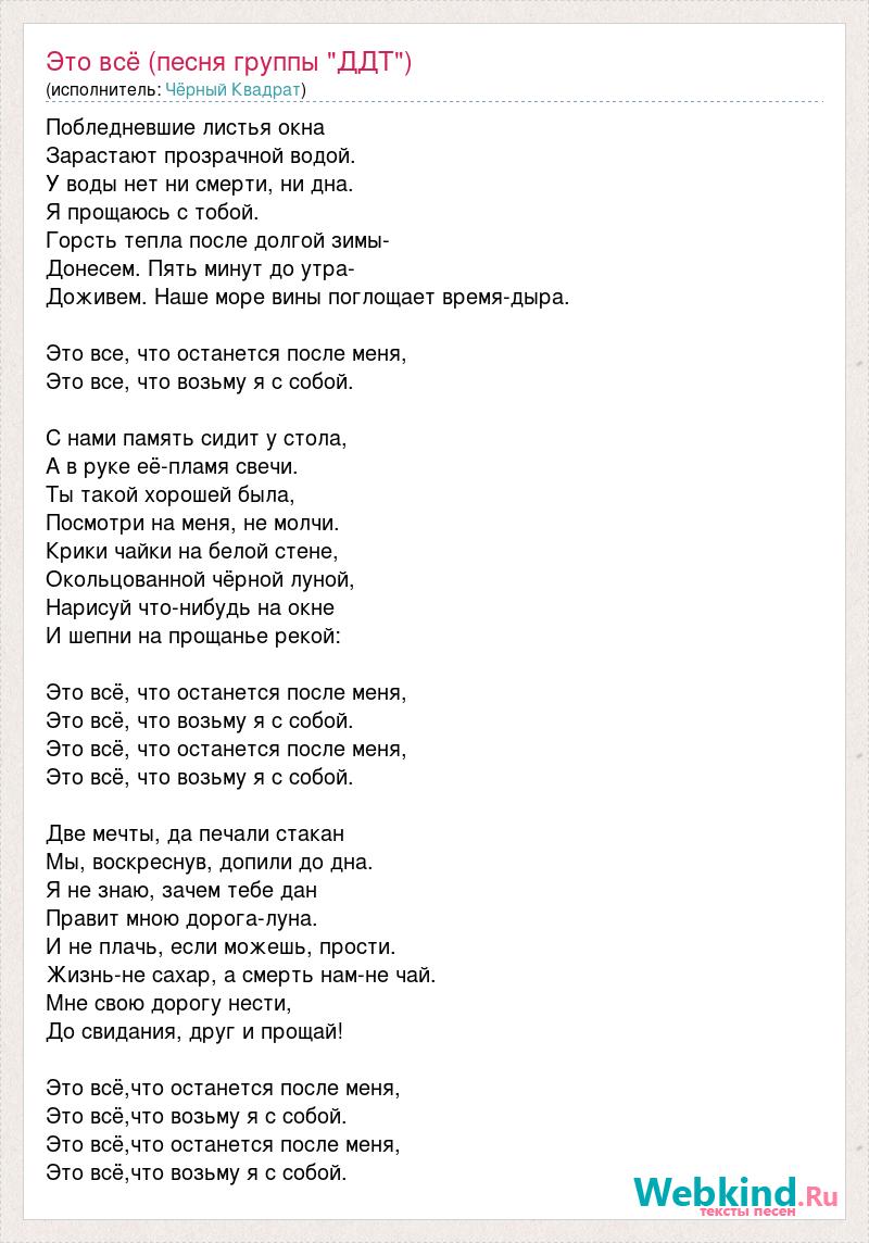 Побледневшие листья окна Зарастают прозрачной водой. У воды нет ни смерти, ни дна. Я прощаюсь с тобой. Горсть тепла после долгой зимы- Донесем. Пять минут до утра- Доживем. Наше море вины поглощает время-дыра. Это все, что останется после меня, Это все, что возьму я с собой. С нами память сидит у стола, А в руке её-пламя свечи. Ты такой хорошей была, Посмотри на меня, не молчи. Крики чайки на белой стене, Окольцованной чёрной луной, Нарисуй что-нибудь на окне И шепни на прощанье рекой: Это всё, что останется после меня, Это всё, что возьму я с собой. Это всё, что останется после меня, Это всё, что возьму я с собой. Две мечты, да печали стакан Мы, воскреснув, допили до дна. Я не знаю, зачем тебе дан Правит мною дорога-луна. И не плачь, если можешь, прости. Жизнь-не сахар, а смерть нам-не чай. Мне свою дорогу нести, До свидания, друг и прощай! Это всё,что останется после меня, Это всё,что возьму я с собой. Это всё,что останется после меня, Это всё,что возьму я с собой.