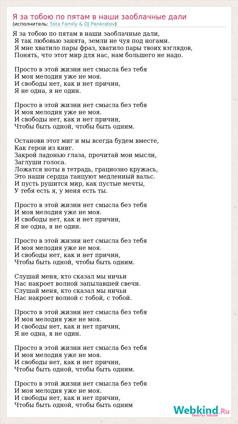 Я за тобою по пятам в наши заоблачные дали, Я так любовью занята, земли не чуя под ногами. Я мне хватило пары фраз, хватило пары твоих взглядов, Понять, что этот мир для нас, нам большего не надо. Просто в этой жизни нет смысла без тебя И моя мелодия уже не моя. И свободы нет, как и нет причин, Я не одна, я не один. Просто в этой жизни нет смысла без тебя И моя мелодия уже не моя. И свободы нет, как и нет причин, Чтобы быть одной, чтобы быть одним. Останови этот миг и мы всегда будем вместе, Как герои из книг. Закрой ладонью глаза, прочитай мои мысли, Заглуши голоса. Ложатся ноты в тетрадь, грациозно кружась, Это наши сердца танцуют медленный вальс. И пусть рушится мир, как пустые мечты, У тебя есть я, у меня есть ты. Просто в этой жизни нет смысла без тебя И моя мелодия уже не моя. И свободы нет, как и нет причин, Я не одна, я не один. Просто в этой жизни нет смысла без тебя И моя мелодия уже не моя. И свободы нет, как и нет причин, Чтобы быть одной, чтобы быть одним. Слушай меня, кто сказал мы ничьи Нас накроет волной запылавшей свечи. Слушай меня, кто сказал мы ничьи Нас накроет волной с тобой, с тобой. Просто в этой жизни нет смысла без тебя И моя мелодия уже не моя. И свободы нет, как и нет причин, Я не одна, я не один. Просто в этой жизни нет смысла без тебя И моя мелодия уже не моя. И свободы нет, как и нет причин, Чтобы быть одной, чтобы быть одним. Просто в этой жизни нет смысла без тебя И моя мелодия уже не моя. И свободы нет, как и нет причин, Чтобы быть одной, чтобы быть одним