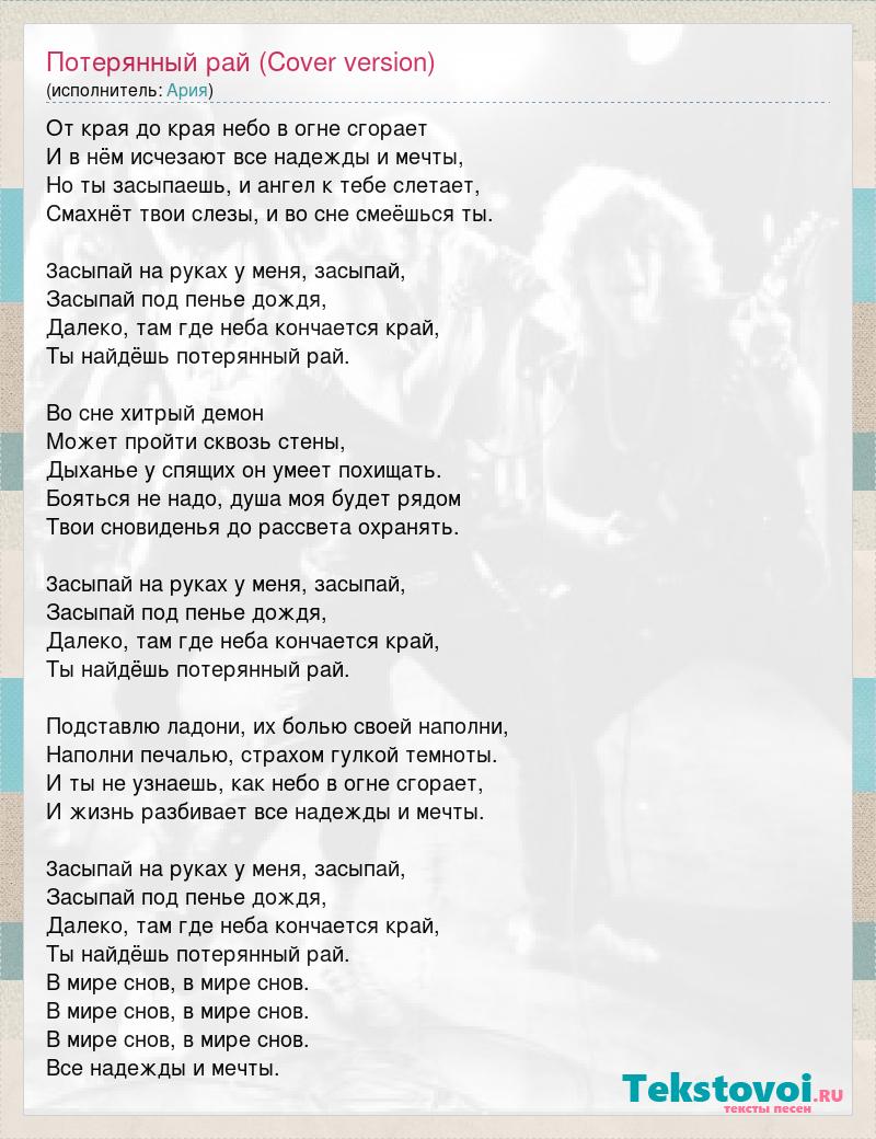 От края до края небо в огне сгорает И в нём исчезают все надежды и мечты, Но ты засыпаешь, и ангел к тебе слетает, Смахнёт твои слезы, и во сне смеёшься ты. 3асыпай на руках у меня, засыпай, Засыпай под пенье дождя, Далеко, там где неба кончается край, Ты найдёшь потерянный рай. Во сне хитрый демон Может пройти сквозь стены, Дыханье у спящих он умеет похищать. Бояться не надо, душа моя будет рядом Твои сновиденья до рассвета охранять. 3асыпай на руках у меня, засыпай, Засыпай под пенье дождя, Далеко, там где неба кончается край, Ты найдёшь потерянный рай. Подставлю ладони, их болью своей наполни, Наполни печалью, страхом гулкой темноты. И ты не узнаешь, как небо в огне сгорает, И жизнь разбивает все надежды и мечты. 3асыпай на руках у меня, засыпай, Засыпай под пенье дождя, Далеко, там где неба кончается край, Ты найдёшь потерянный рай. В мире снов, в мире снов. В мире снов, в мире снов. В мире снов, в мире снов. Все надежды и мечты.