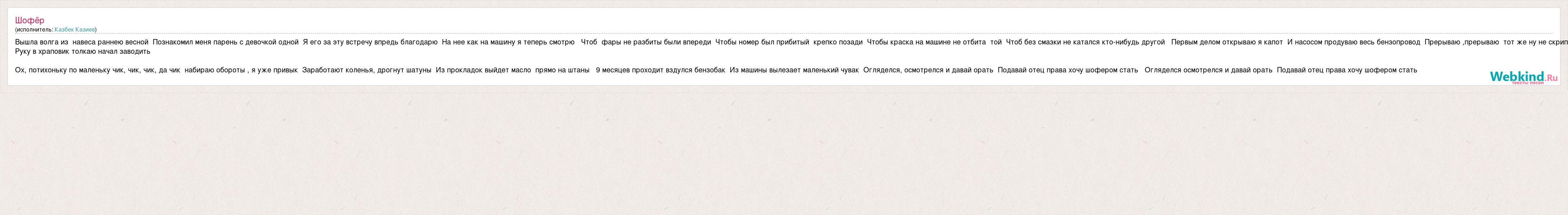 Вышла волга из навеса раннею весной Познакомил меня парень с девочкой одной Я его за эту встречу впредь благодарю На нее как на машину я теперь смотрю Чтоб фары не разбиты были впереди Чтобы номер был прибитый крепко позади Чтобы краска на машине не отбита той Чтоб без смазки не катался кто-нибудь другой Первым делом открываю я капот И насосом продуваю весь бензопровод Прерываю ,прерываю тот же ну не скрип Руку в храповик толкаю начал заводить Ох, потихоньку по маленьку чик, чик, чик, да чик набираю обороты , я уже привык Заработают коленья, дрогнут шатуны Из прокладок выйдет масло прямо на штаны 9 месяцев проходит вздулся бензобак Из машины вылезает маленький чувак Огляделся, осмотрелся и давай орать Подавай отец права хочу шофером стать Огляделся осмотрелся и давай орать Подавай отец права хочу шофером стать