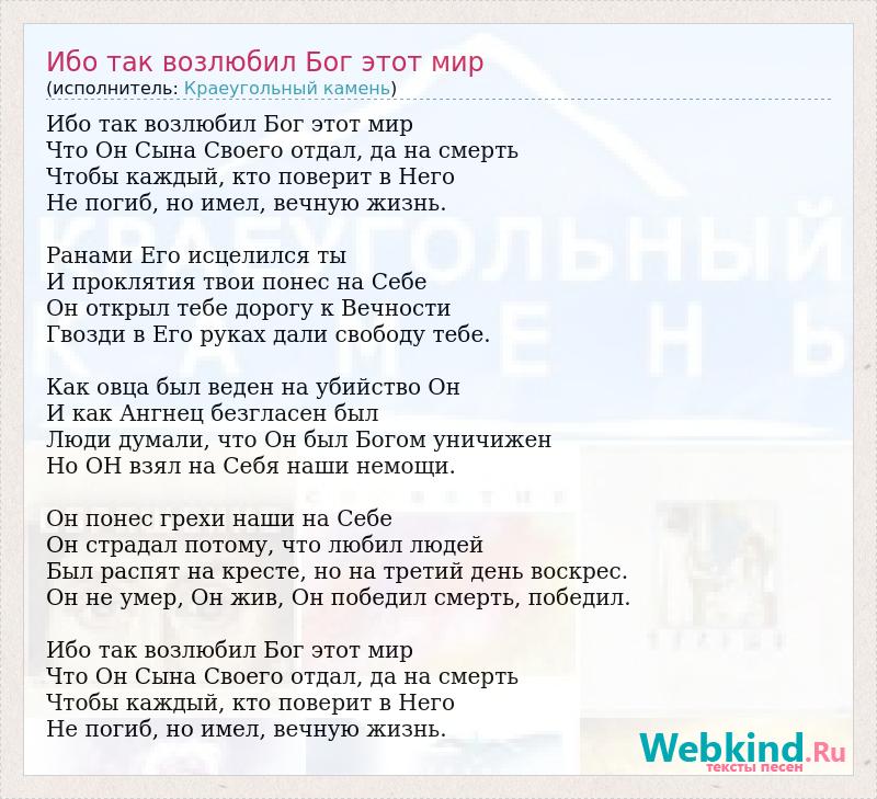 Ибо так возлюбил Бог этот мир Что Он Сына Своего отдал, да на смерть Чтобы каждый, кто поверит в Него Не погиб, но имел, вечную жизнь. Ранами Его исцелился ты И проклятия твои понес на Себе Он открыл тебе дорогу к Вечности Гвозди в Его руках дали свободу тебе. Как овца был веден на убийство Он И как Ангнец безгласен был Люди думали, что Он был Богом уничижен Но ОН взял на Себя наши немощи. Он понес грехи наши на Себе Он страдал потому, что любил людей Был распят на кресте, но на третий день воскрес. Он не умер, Он жив, Он победил смерть, победил. Ибо так возлюбил Бог этот мир Что Он Сына Своего отдал, да на смерть Чтобы каждый, кто поверит в Него Не погиб, но имел, вечную жизнь.