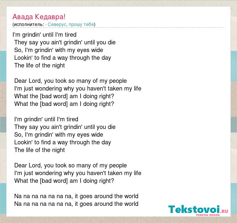 I'm grindin' until I'm tired They say you ain't grindin' until you die So, I'm grindin' with my eyes wide Lookin' to find a way through the day The life of the night Dear Lord, you took so many of my people I'm just wondering why you haven't taken my life What the [bad word] am I doing right? What the [bad word] am I doing right? I'm grindin' until I'm tired They say you ain't grindin' until you die So, I'm grindin' with my eyes wide Lookin' to find a way through the day The life of the night Dear Lord, you took so many of my people I'm just wondering why you haven't taken my life What the [bad word] am I doing right? Na na na na na na na, it goes around the world Na na na na na na na, it goes around the world