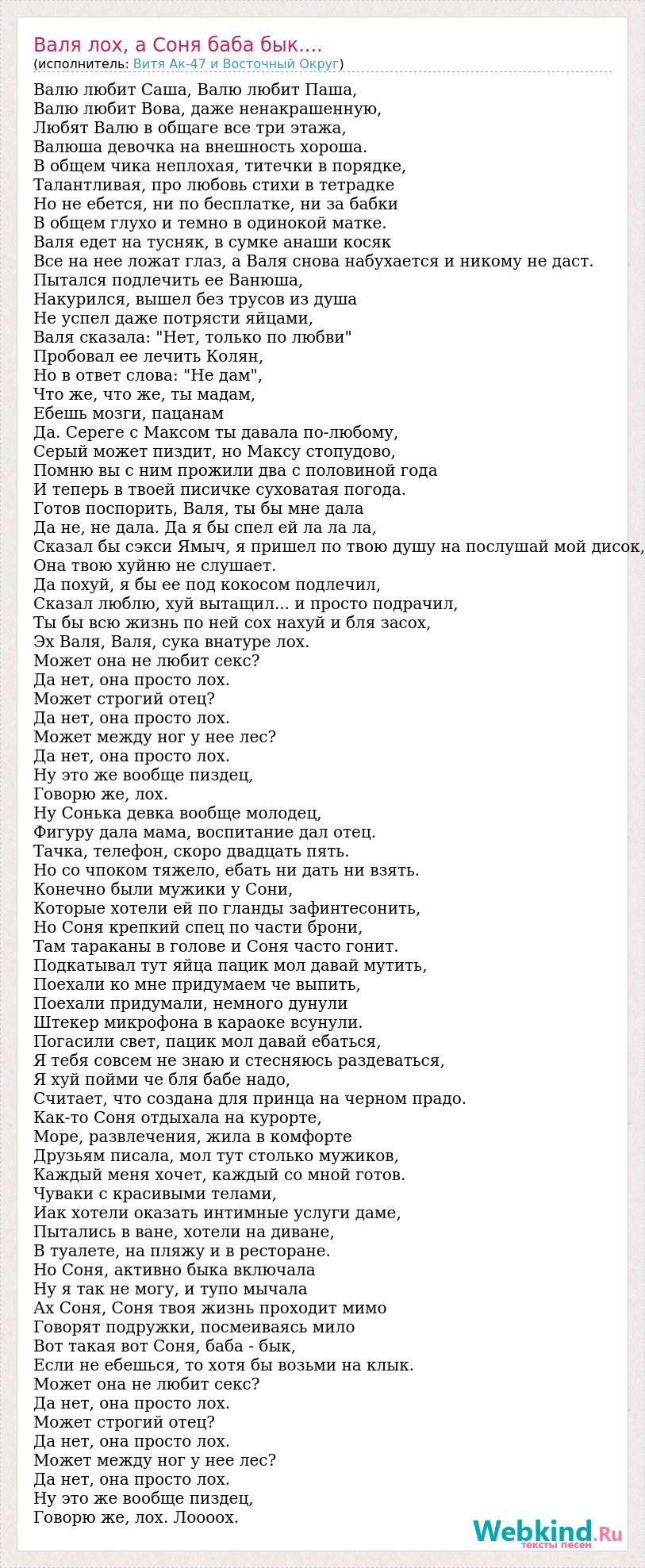 Валю любит Саша, Валю любит Паша, Валю любит Вова, даже ненакрашенную, Любят Валю в общаге все три этажа, Валюша девочка на внешность хороша. В общем чика неплохая, титечки в порядке, Талантливая, про любовь стихи в тетрадке Но не ебется, ни по бесплатке, ни за бабки В общем глухо и темно в одинокой матке. Валя едет на тусняк, в сумке анаши косяк Все на нее ложат глаз, а Валя снова набухается и никому не даст. Пытался подлечить ее Ванюша, Накурился, вышел без трусов из душа Не успел даже потрясти яйцами, Валя сказала: "Нет, только по любви" Пробовал ее лечить Колян, Но в ответ слова: "Не дам", Что же, что же, ты мадам, Ебешь мозги, пацанам Да. Сереге с Максом ты давала по-любому, Серый может пиздит, но Максу стопудово, Помню вы с ним прожили два с половиной года И теперь в твоей писичке суховатая погода. Готов поспорить, Валя, ты бы мне дала Да не, не дала. Да я бы спел ей ла ла ла, Сказал бы сэкси Ямыч, я пришел по твою душу на послушай мой дисок, Она твою хуйню не слушает. Да похуй, я бы ее под кокосом подлечил, Сказал люблю, хуй вытащил... и просто подрачил, Ты бы всю жизнь по ней сох нахуй и бля засох, Эх Валя, Валя, сука внатуре лох. Может она не любит секс? Да нет, она просто лох. Может строгий отец? Да нет, она просто лох. Может между ног у нее лес? Да нет, она просто лох. Ну это же вообще пиздец, Говорю же, лох. Ну Сонька девка вообще молодец, Фигуру дала мама, воспитание дал отец. Тачка, телефон, скоро двадцать пять. Но со чпоком тяжело, ебать ни дать ни взять. Конечно были мужики у Сони, Которые хотели ей по гланды зафинтесонить, Но Соня крепкий спец по части брони, Там тараканы в голове и Соня часто гонит. Подкатывал тут яйца пацик мол давай мутить, Поехали ко мне придумаем че выпить, Поехали придумали, немного дунули Штекер микрофона в караоке всунули. Погасили свет, пацик мол давай ебаться, Я тебя совсем не знаю и стесняюсь раздеваться, Я хуй пойми че бля бабе надо, Считает, что создана для принца на черном прадо. Как-то Соня отдыхала на курорте, Море, развлечения, жила в комфорте Друзьям писала, мол тут столько мужиков, Каждый меня хочет, каждый со мной готов. Чуваки с красивыми телами, Иак хотели оказать интимные услуги даме, Пытались в ване, хотели на диване, В туалете, на пляжу и в ресторане. Но Соня, активно быка включала Ну я так не могу, и тупо мычала Ах Соня, Соня твоя жизнь проходит мимо Говорят подружки, посмеиваясь мило Вот такая вот Соня, баба - бык, Если не ебешься, то хотя бы возьми на клык. Может она не любит секс? Да нет, она просто лох. Может строгий отец? Да нет, она просто лох. Может между ног у нее лес? Да нет, она просто лох. Ну это же вообще пиздец, Говорю же, лох. Лоооох.