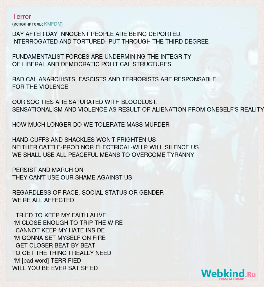 DAY AFTER DAY INNOCENT PEOPLE ARE BEING DEPORTED, INTERROGATED AND TORTURED- PUT THROUGH THE THIRD DEGREE FUNDAMENTALIST FORCES ARE UNDERMINING THE INTEGRITY OF LIBERAL AND DEMOCRATIC POLITICAL STRUCTURES RADICAL ANARCHISTS, FASCISTS AND TERRORISTS ARE RESPONSABLE FOR THE VIOLENCE OUR SOCITIES ARE SATURATED WITH BLOODLUST, SENSATIONALISM AND VIOLENCE AS RESULT OF ALIENATION FROM ONESELF'S REALITY HOW MUCH LONGER DO WE TOLERATE MASS MURDER HAND-CUFFS AND SHACKLES WON'T FRIGHTEN US NEITHER CATTLE-PROD NOR ELECTRICAL-WHIP WILL SILENCE US WE SHALL USE ALL PEACEFUL MEANS TO OVERCOME TYRANNY PERSIST AND MARCH ON THEY CAN'T USE OUR SHAME AGAINST US REGARDLESS OF RACE, SOCIAL STATUS OR GENDER WE'RE ALL AFFECTED I TRIED TO KEEP MY FAITH ALIVE I'M CLOSE ENOUGH TO TRIP THE WIRE I CANNOT KEEP MY HATE INSIDE I'M GONNA SET MYSELF ON FIRE I GET CLOSER BEAT BY BEAT TO GET THE THING I REALLY NEED I'M [bad word] TERRIFIED WILL YOU BE EVER SATISFIED