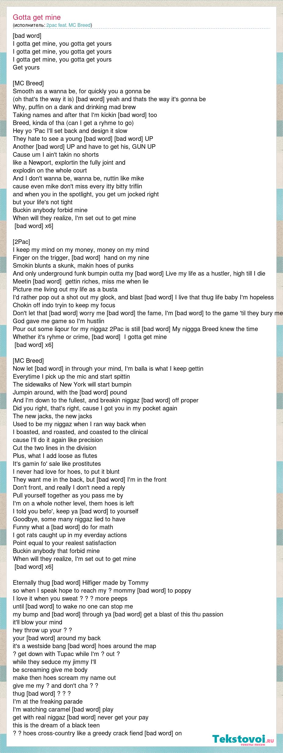 [Chorus] I gotta get mine, you gotta get yours I gotta get mine, you gotta get yours I gotta get mine, you gotta get yours Get yours [MC Breed] Smooth as a wanna be, for quickly you a gonna be (oh that's the way it is) [bad word] yeah and thats the way it's gonna be Why, puffin on a dank and drinking mad brew Taking names and after that I'm kickin [bad word] too Breed, kinda of tha (can I get a ryhme to go) Hey yo 'Pac I'll set back and design it slow They hate to see a young [bad word] COME UP Another punk, RUN UP and have to get his, GUN UP Cause um I ain't takin no shorts like a Newport, explortin the fully joint and explodin on the whole court And I don't wanna be, wanna be, nuttin like mike cause even mike don't miss every itty bitty triflin and when you in the spotlight, you get um jocked right but your life's not tight Buckin anybody forbid mine When will they realize, I'm set out to get mine [Chorus x6] [2Pac] I keep my mind on my money, money on my mind Finger on the trigger, [bad word] hand on my nine Smokin blunts a skunk, makin hoes of punks And only underground funk bumpin outta my trunk Live my life as a hustler, high till I die Meetin [bad word] gettin riches, miss me when lie Picture me living out my life as a busta I'd rather pop out a shot out my glock, and blast [bad word] I live that thug life baby I'm hopeless Chokin off indo tryin to keep my focus Don't let that [bad word] worry me [bad word] the fame, I'm true to the game 'til they bury me God gave me game so I'm hustlin Pour out some liqour for my niggaz 2Pac is still strugglin My niggga Breed knew the time Whether it's ryhme or crime, [bad word] I gotta get mine [Chorus x6] [MC Breed] Now let me rush in through your mind, I'm balla is what I keep gettin Everytime I pick up the mic and start spittin The sidewalks of New York will start bumpin Jumpin around, with the [bad word] pound And I'm down to the fullest, and breakin niggaz [bad word] off proper Did you right, that's right, cause I got you in my pocket again The new jacks, the new jacks Used to be my niggaz when I ran way back when I boasted, and roasted, and coasted to the clinical cause I'll do it again like precision Cut the two lines in the division Plus, what I add loose as flutes It's gamin fo' sale like prostitutes I never had love for hoes, to put it blunt They want me in the back, but [bad word] I'm in the front Don't front, and really I don't need a reply Pull yourself together as you pass me by I'm on a whole nother level, them hoes is left I told you befo', keep ya [bad word] to yourself Goodbye, some many niggaz lied to have Funny what a [bad word] do for math I got rats caught up in my everday actions Point equal to your realest satisfaction Buckin anybody that forbid mine When will they realize, I'm set out to get mine [Chorus x6] Eternally thug [bad word] Hilfiger made by Tommy so when I speak hope to reach my ? mommy oh come to poppy I love it when you sweat ? ? ? more peeps until I come to wake no one can stop me my bump and grind coming through ya everytime come get a blast of this thu passion it'll blow your mind hey throw up your ? ? your [bad word] around my back it's a westside bang [bad word] hoes around the map ? get down with Tupac while I'm ? out ? while they seduce my jimmy I'll be screaming give me body make then hoes scream my name out give me my ? and don't cha ? ? thug [bad word] ? ? ? I'm at the freaking parade I'm watching caramel [bad word] play get with real niggaz [bad word] never get your pay this is the dream of a black teen ? ? hoes cross-country like a greedy crack fiend now come on