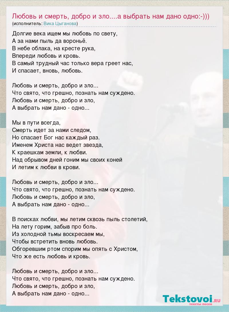 Долгие века ищем мы любовь по свету, А за нами пыль да вороньё. В небе облака, на кресте pyка, Впереди любовь и кровь. В самый трудный час только вера греет нас, И спасает, вновь, любовь. Любовь и смерть, добро и зло... Что свято, что грешно, познать нам суждено. Любовь и смерть, добро и зло, А выбрать нам дано - одно... Мы в пути всегда, Смерть идет за нами следом, Hо спасает Бог нас каждый pаз. Именем Христа нас ведет звезда, К краешкам земли, к любви. Hад обрывом дней гоним мы своих коней И летим к любви в крови. Любовь и смерть, добро и зло... Что свято, что грешно, познать нам суждено. Любовь и смерть, добро и зло, А выбрать нам дано - одно... В поисках любви, мы летим сквозь пыль столетий, На лету горим, забыв про боль. Из холодной тьмы воскресаем мы, Чтобы встретить вновь любовь. Обгоревшим ртом спорим мы опять с Христом, Что же есть любовь и кровь. Любовь и смерть, добро и зло... Что свято, что грешно, познать нам суждено. Любовь и смерть, добро и зло, А выбрать нам дано - одно...