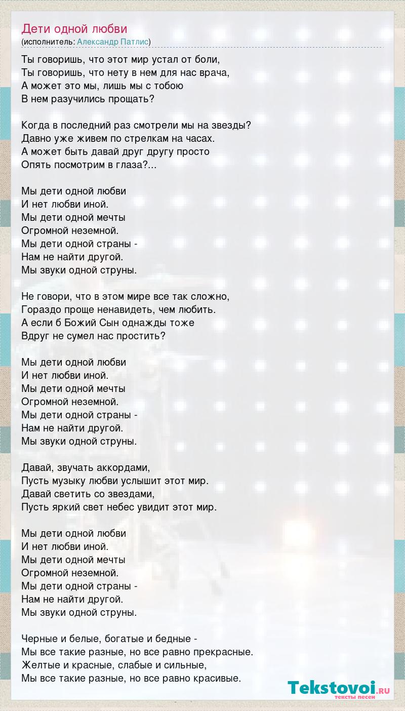 Ты говоришь, что этот мир устал от боли, Ты говоришь, что нету в нем для нас врача, А может это мы, лишь мы с тобою В нем разучились прощать? Когда в последний раз смотрели мы на звезды? Давно уже живем по стрелкам на часах. А может быть давай друг другу просто Опять посмотрим в глаза?... Мы дети одной любви И нет любви иной. Мы дети одной мечты Огромной неземной. Мы дети одной страны - Нам не найти другой. Мы звуки одной струны. Не говори, что в этом мире все так сложно, Гораздо проще ненавидеть, чем любить. А если б Божий Сын однажды тоже Вдруг не сумел нас простить? Мы дети одной любви И нет любви иной. Мы дети одной мечты Огромной неземной. Мы дети одной страны - Нам не найти другой. Мы звуки одной струны. Давай, звучать аккордами, Пусть музыку любви услышит этот мир. Давай светить со звездами, Пусть яркий свет небес увидит этот мир. Мы дети одной любви И нет любви иной. Мы дети одной мечты Огромной неземной. Мы дети одной страны - Нам не найти другой. Мы звуки одной струны. Черные и белые, богатые и бедные - Мы все такие разные, но все равно прекрасные. Желтые и красные, слабые и сильные, Мы все такие разные, но все равно красивые.