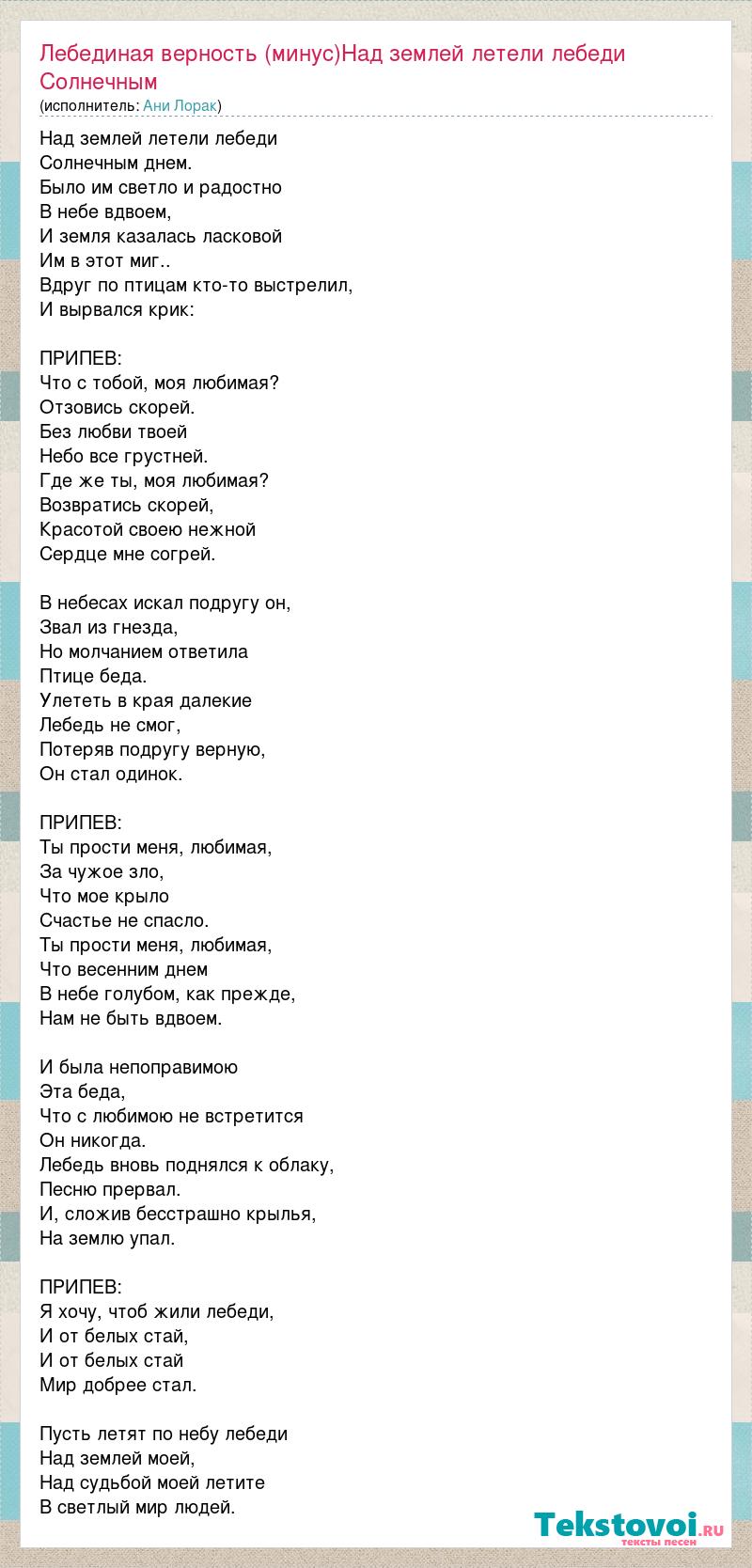 Над землей летели лебеди Солнечным днем. Было им светло и радостно В небе вдвоем, И земля казалась ласковой Им в этот миг.. Вдруг по птицам кто-то выстрелил, И вырвался крик: ПРИПЕВ: Что с тобой, моя любимая? Отзовись скорей. Без любви твоей Небо все грустней. Где же ты, моя любимая? Возвратись скорей, Красотой своею нежной Сердце мне согрей. В небесах искал подругу он, Звал из гнезда, Но молчанием ответила Птице беда. Улететь в края далекие Лебедь не смог, Потеряв подругу верную, Он стал одинок. ПРИПЕВ: Ты прости меня, любимая, За чужое зло, Что мое крыло Счастье не спасло. Ты прости меня, любимая, Что весенним днем В небе голубом, как прежде, Нам не быть вдвоем. И была непоправимою Эта беда, Что с любимою не встретится Он никогда. Лебедь вновь поднялся к облаку, Песню прервал. И, сложив бесстрашно крылья, На землю упал. ПРИПЕВ: Я хочу, чтоб жили лебеди, И от белых стай, И от белых стай Мир добрее стал. Пусть летят по небу лебеди Над землей моей, Над судьбой моей летите В светлый мир людей.