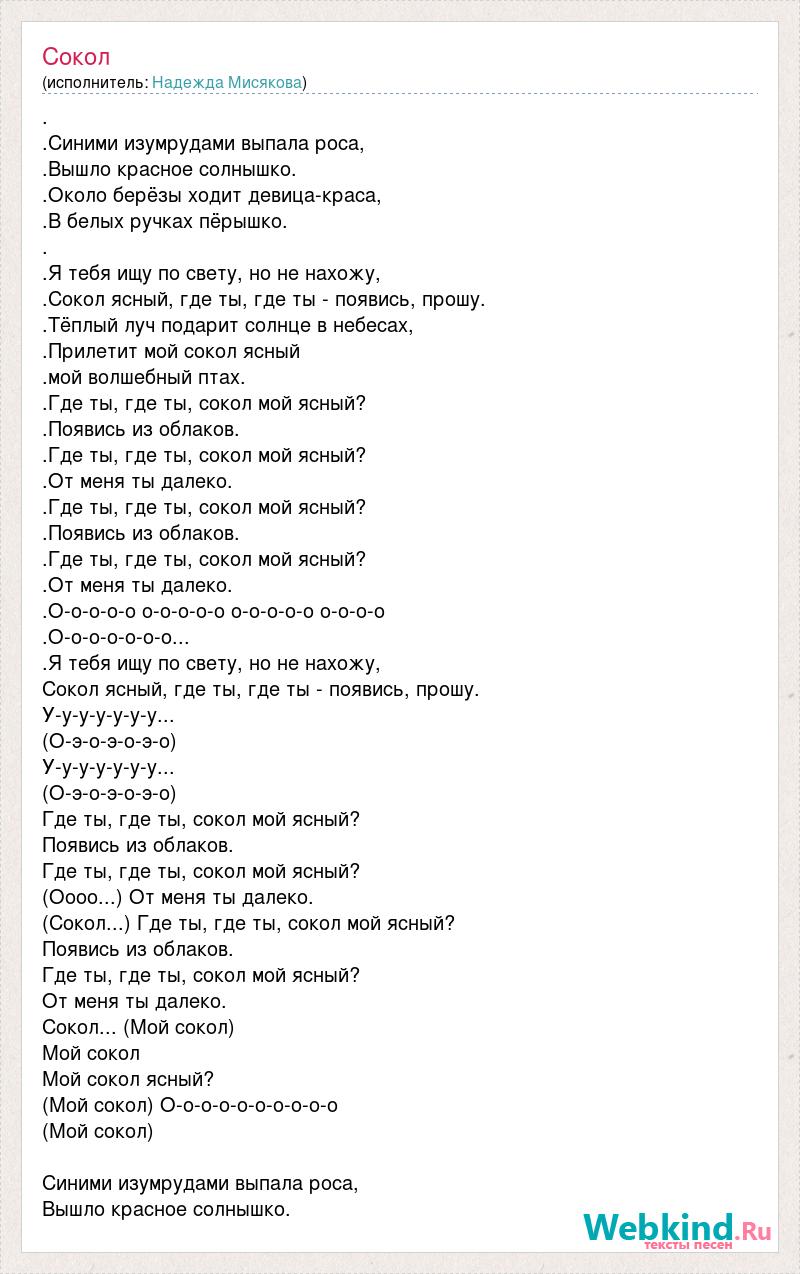 . .Синими изумрудами выпала роса, .Вышло красное солнышко. .Около берёзы ходит девица-краса, .В белых ручках пёрышко. . .Я тебя ищу по свету, но не нахожу, .Сокол ясный, где ты, где ты - появись, прошу. .Тёплый луч подарит солнце в небесах, .Прилетит мой сокол ясный .мой волшебный птах. .Где ты, где ты, сокол мой ясный? .Появись из облаков. .Где ты, где ты, сокол мой ясный? .От меня ты далеко. .Где ты, где ты, сокол мой ясный? .Появись из облаков. .Где ты, где ты, сокол мой ясный? .От меня ты далеко. .О-о-о-о-о о-о-о-о-о о-о-о-о-о о-о-о-о .О-о-о-о-о-о-о... .Я тебя ищу по свету, но не нахожу, Сокол ясный, где ты, где ты - появись, прошу. У-у-у-у-у-у-у... (О-э-о-э-о-э-о) У-у-у-у-у-у-у... (О-э-о-э-о-э-о) Где ты, где ты, сокол мой ясный? Появись из облаков. Где ты, где ты, сокол мой ясный? (Оооо...) От меня ты далеко. (Сокол...) Где ты, где ты, сокол мой ясный? Появись из облаков. Где ты, где ты, сокол мой ясный? От меня ты далеко. Сокол... (Мой сокол) Мой сокол Мой сокол ясный? (Мой сокол) О-о-о-о-о-о-о-о-о-о (Мой сокол) Синими изумрудами выпала роса, Вышло красное солнышко.