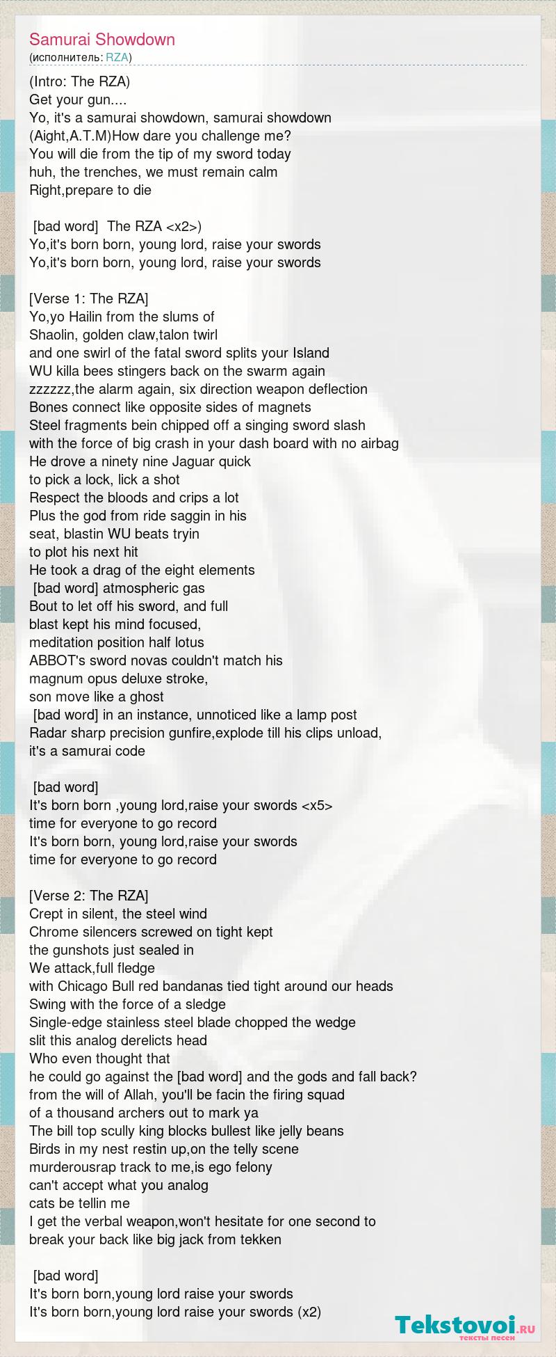 (Intro: The RZA) Get your gun.... Yo, it's a samurai showdown, samurai showdown (Aight,A.T.M)How dare you challenge me? You will die from the tip of my sword today huh, the trenches, we must remain calm Right,prepare to die [bad word] The RZA <x2>) Yo,it's born born, young lord, raise your swords Yo,it's born born, young lord, raise your swords [Verse 1: The RZA] Yo,yo Hailin from the slums of Shaolin, golden claw,talon twirl and one swirl of the fatal sword splits your Island WU killa bees stingers back on the swarm again zzzzzz,the alarm again, six direction weapon deflection Bones connect like opposite sides of magnets Steel fragments bein chipped off a singing sword slash with the force of big crash in your dash board with no airbag He drove a ninety nine Jaguar quick to pick a lock, lick a shot Respect the bloods and crips a lot Plus the god from ride saggin in his seat, blastin WU beats tryin to plot his next hit He took a drag of the eight elements [bad word] atmospheric gas Bout to let off his sword, and full blast kept his mind focused, meditation position half lotus ABBOT's sword novas couldn't match his magnum opus deluxe stroke, son move like a ghost [bad word] in an instance, unnoticed like a lamp post Radar sharp precision gunfire,explode till his clips unload, it's a samurai code [bad word] It's born born ,young lord,raise your swords <x5> time for everyone to go record It's born born, young lord,raise your swords time for everyone to go record [Verse 2: The RZA] Crept in silent, the steel wind Chrome silencers screwed on tight kept the gunshots just sealed in We attack,full fledge with Chicago Bull red bandanas tied tight around our heads Swing with the force of a sledge Single-edge stainless steel blade chopped the wedge slit this analog derelicts head Who even thought that he could go against the [bad word] and the gods and fall back? from the will of Allah, you'll be facin the firing squad of a thousand archers out to mark ya The bill top scully king blocks bullest like jelly beans Birds in my nest restin up,on the telly scene murderousrap track to me,is ego felony can't accept what you analog cats be tellin me I get the verbal weapon,won't hesitate for one second to break your back like big jack from tekken [bad word] It's born born,young lord raise your swords It's born born,young lord raise your swords (x2)